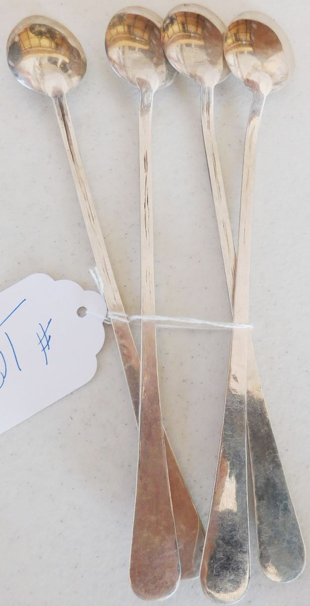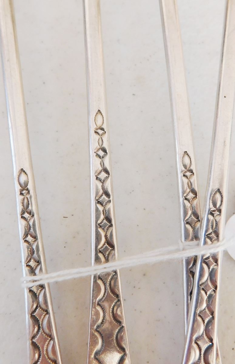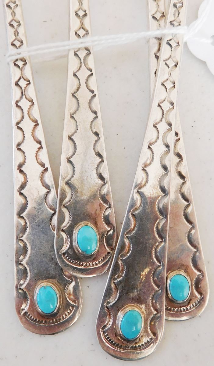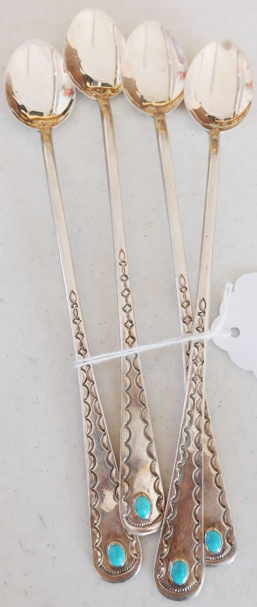 Four Sterling Silver Navajo Spoons with turquoise studs. C. 1950s. These spoons have long handles. The spoons measure 8 1/2 x 1 1/8 inches. Condition: The items are nice, just polished, but patina will return. Shipping: $15.50