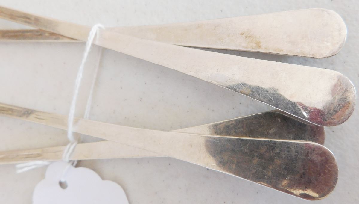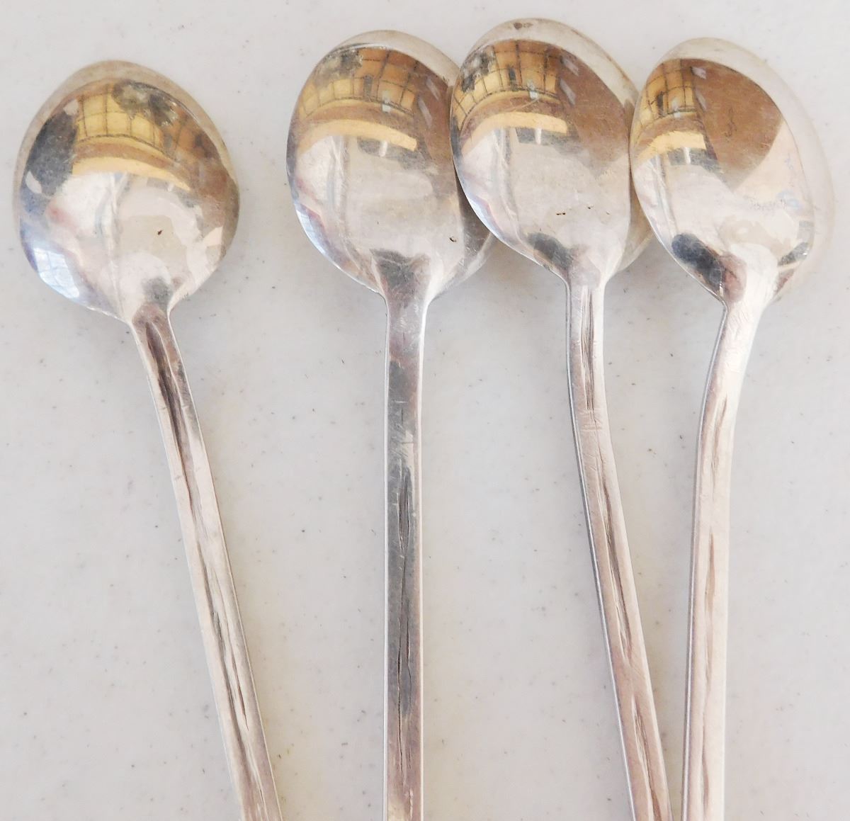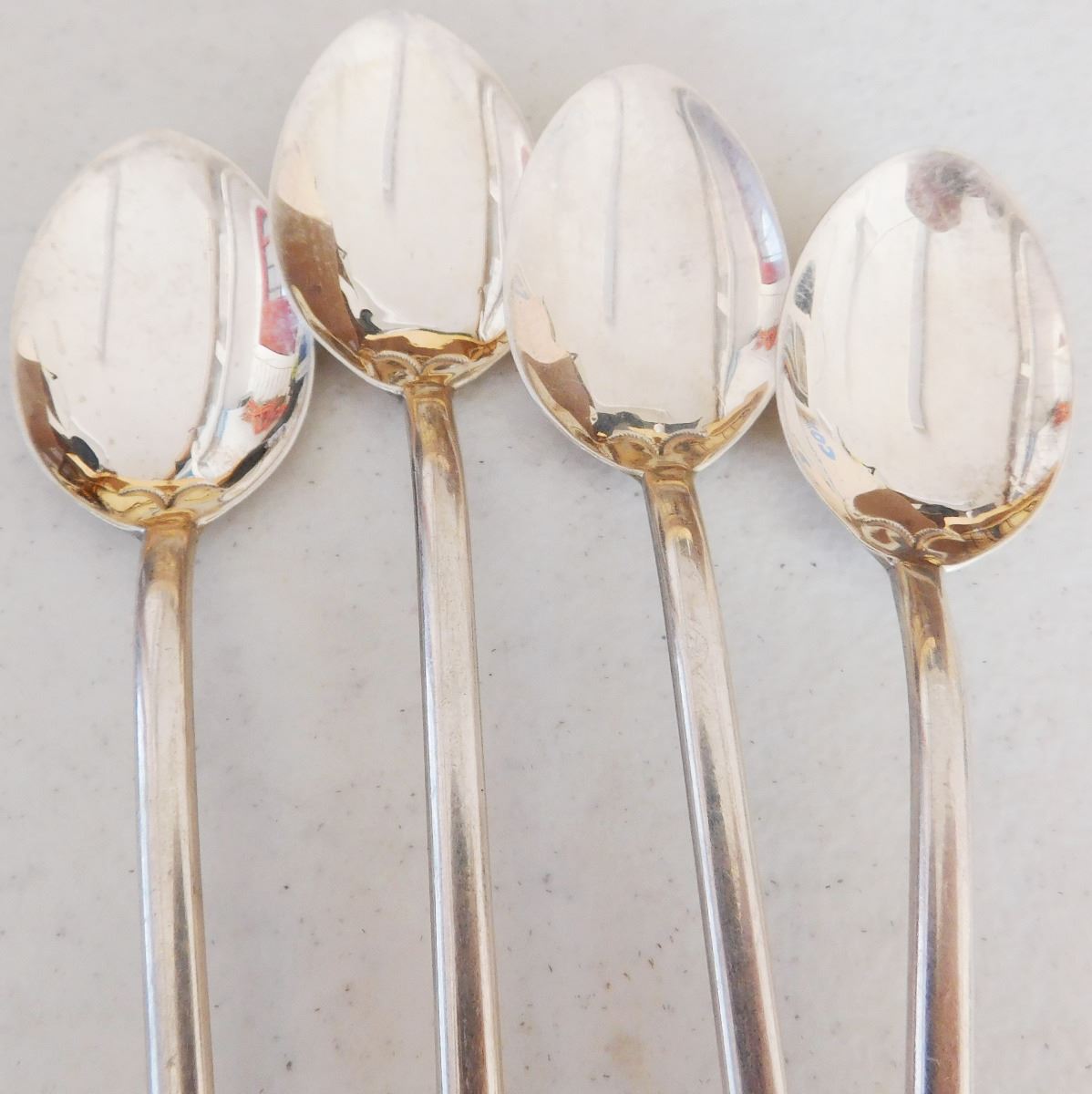 Four Sterling Silver Navajo Spoons with turquoise studs. C. 1950s. These spoons have long handles. The spoons measure 8 1/2 x 1 1/8 inches. Condition: The items are nice, just polished, but patina will return. Shipping: $15.50