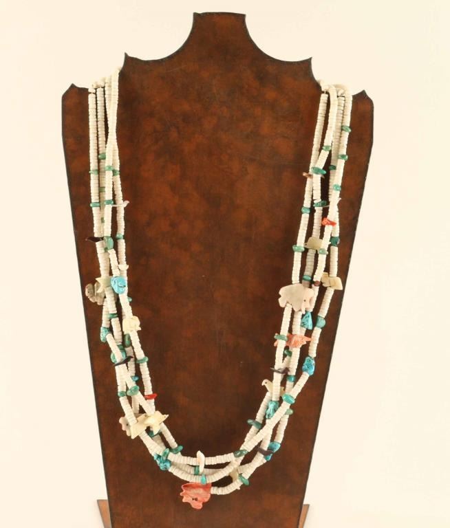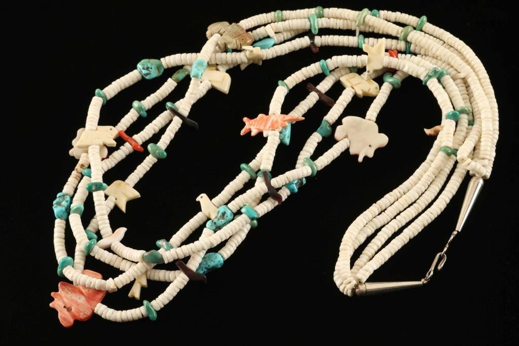 Four strands of white heishi beads with turquoise and coral stones interspersed with spiny oyster and agate buffalo, fish, birds and other creatures. Measures 28 1/2" l.