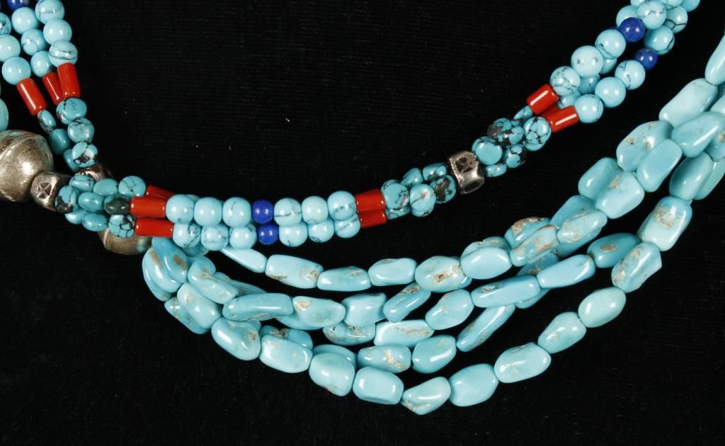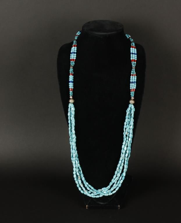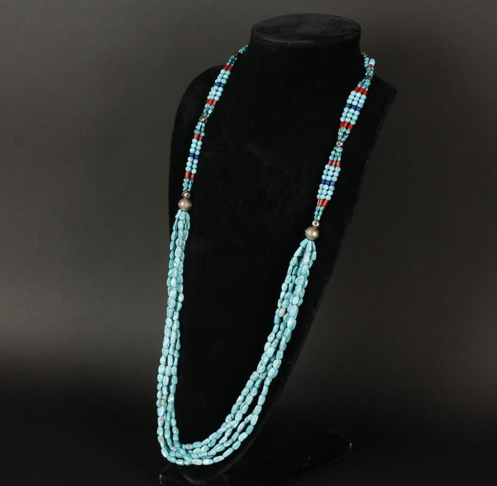 With Sleeping Beauty turquoise accented with sterling beads, coral, and lapis. "TA" Tony Aguilar Sterling beads.