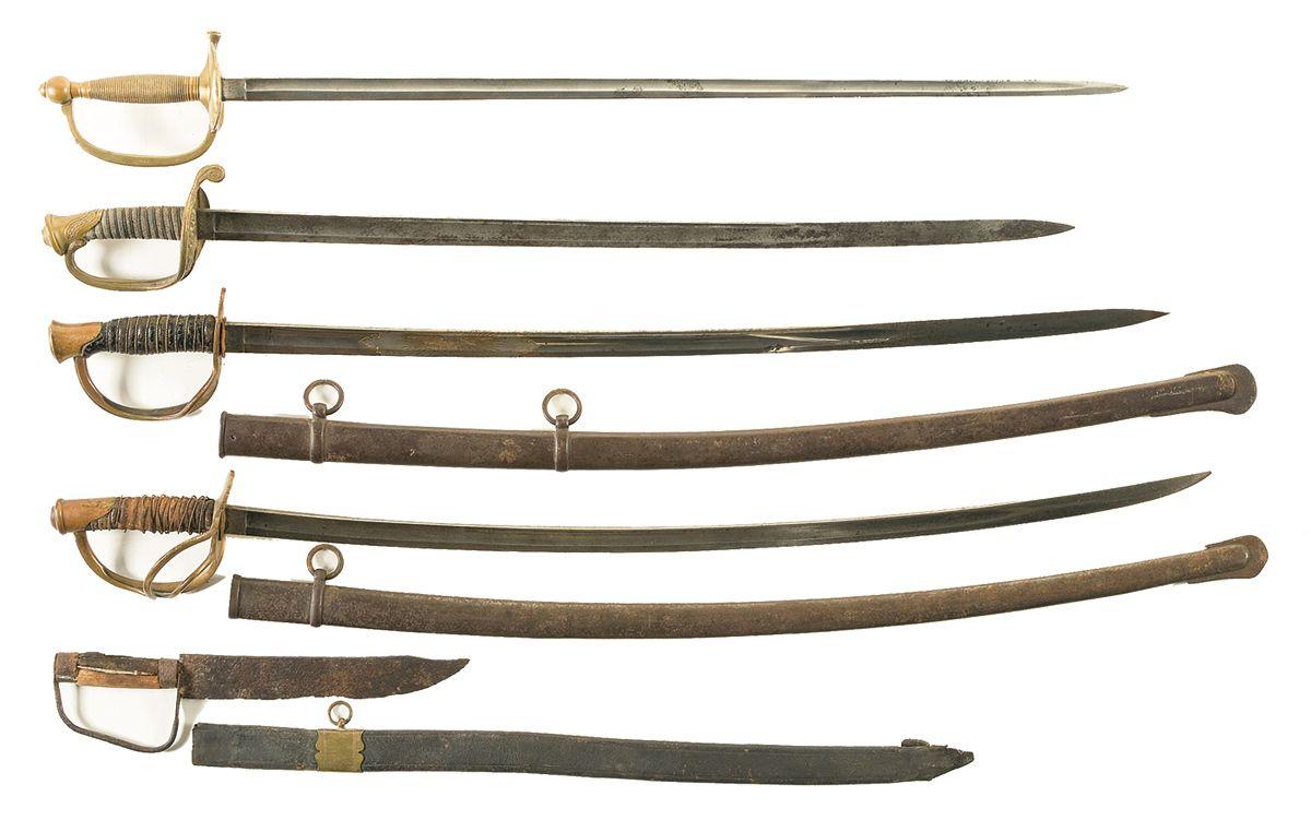 1) W.H. Horstmann & Sons saber, 33" curved single fuller blade with makers mark on the right side, solid metal hand guard and ribbed wood grip. Blade has the Federal Eagle on the right is marked "U.S." on the left. With metal scabbard 2) Tiffany & Co. , 30" curved double fuller blade, solid brass hilt with floral motif, wire wrapped ray skin grip. With leather scabbard. Scabbard is poor. 3) C. Roby 1864 dated Cavalry saber. 34" curved double fuller blade, three branch brass guard with a wire wrapped grip. Complete with metal scabbard. 4) Model 1840 NCO Sword with 32" straight single fuller blade, U.S. marked, 1863 dated with a brass knuckle bow and grip. 5) Relic grade Confederate style Bowie knife. 10" blade, iron knuckle guard and smooth wood grips. Unless otherwise noted all items are fair to very good.