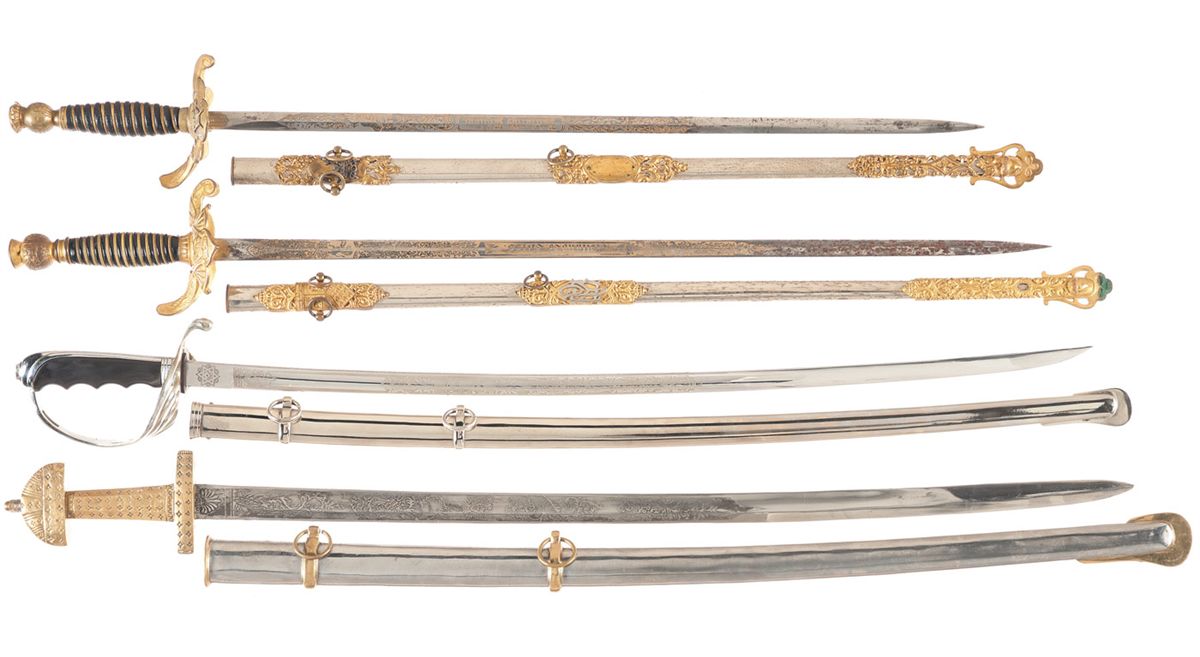 1) Horster U.S. 1902 sword, 30" blade, with sheath. 2) Brass-hilted sword, 31" etched blade, nickel and brass sheath. 3) Marshall-production Patriarchs Militant sword, 28" blade etched to "Rolland H. Bliss", gilt hilt and sheath components. 4) Horstmann Bros.-production Patriarchs Militant sword, 25 3/4" blade etched "W.F.Robb", otherwise as 3. Good overall.