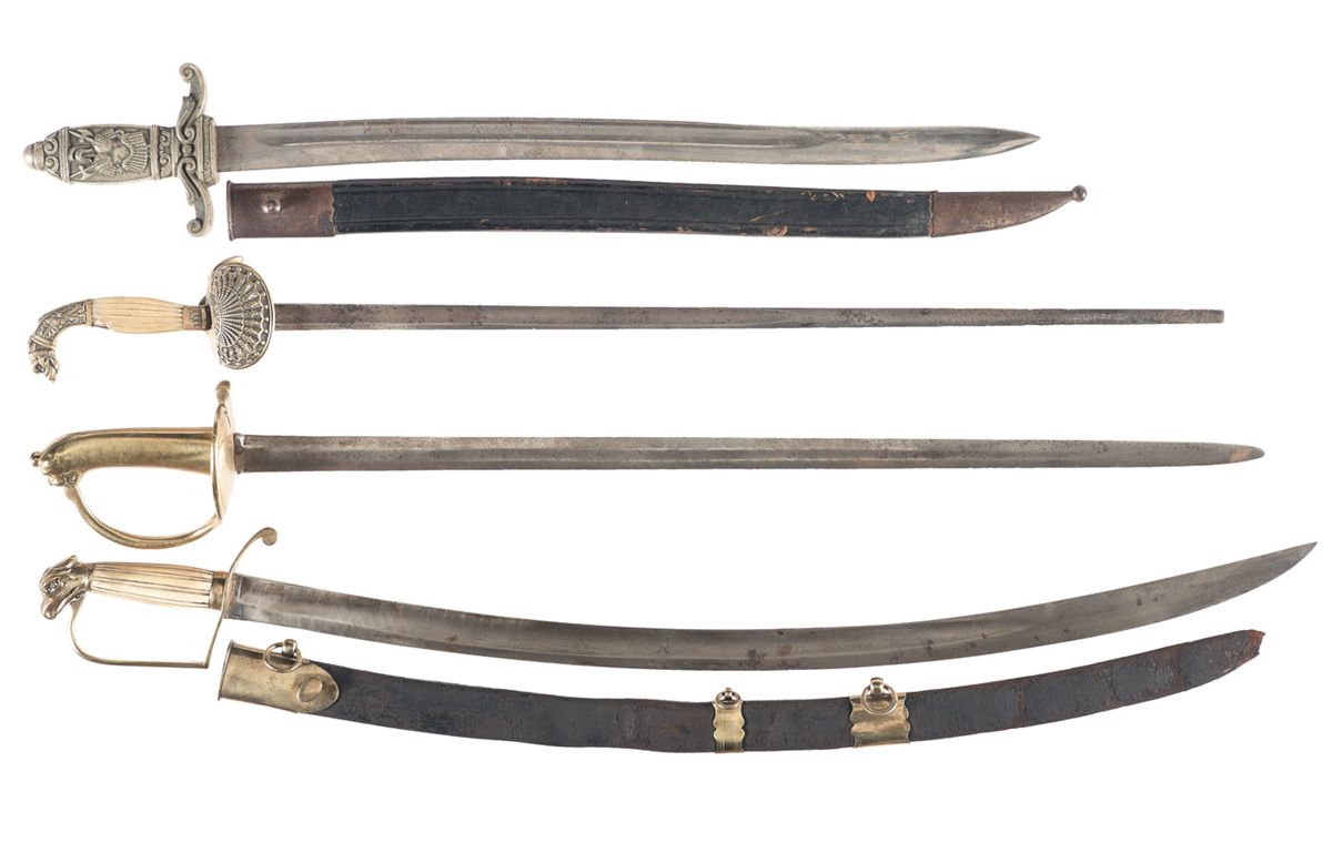 1) Eagle head sword, 30" single fuller blade, ribbed grip, leather scabbard. 2) Lion head sword, 28 1/1/4" blade, brass hilt. 3) Court sword, 27 1/2" bladem silvered brass hilt, pearl panels. Poor. 4) Short sword, 22 3/4" yataghan blade, cast grip, leather scabbard. Except as noted, fair or better overall.