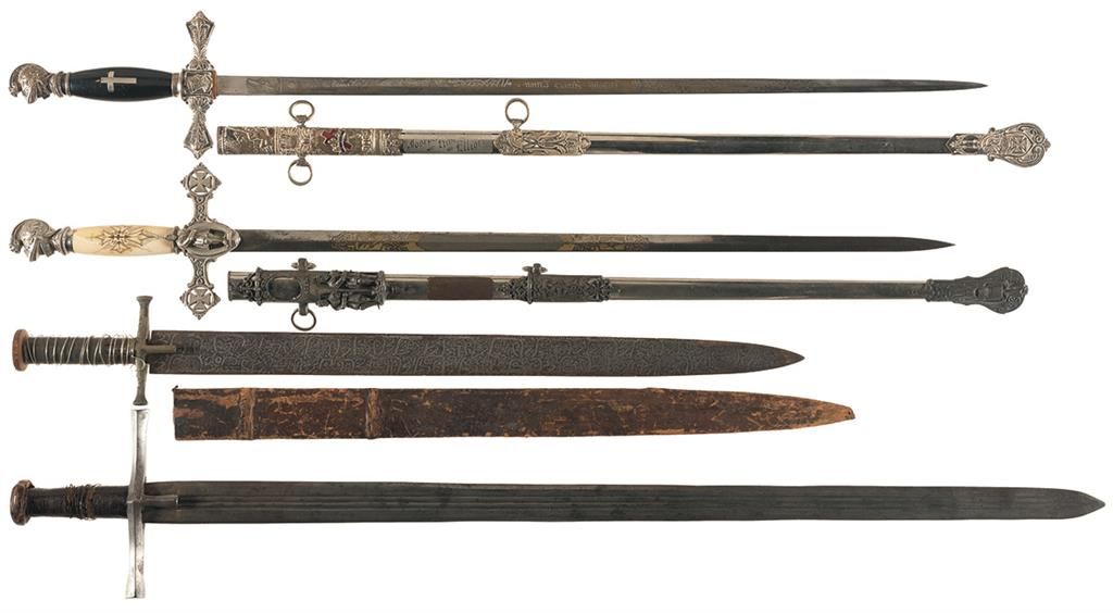 1) Henderson-Ames Knights Templar lodge sword, 35 1/8" overall, 27 3/4" etched gold accented blade, nickel finish, black lacquered grip with nickel cross, nickel sheath. Blade and sheath etched to "Joseph Rivers Elliot". Good. 2) Henderson ivory gripped Templar sword, 34" overall with a 26 3/4" etched and gold washed blade, nickel fittings, one piece ivory grip with religious designs, and a nickel sheath with figural decoration. The name has been ground off the blade and sheath, and the "cross in crown" icon has been removed; the significance of this is unknown, otherwise very good. 3) Short sword, 28" overall, 23 1/2" etched blade, dual quillion guard, tin plate/wire wrapped grip, disc pommel, leather sheath. Poor to fair. 4) Arming sword, 38 3/4" overall, 34" triple-fuller blade, dual quillion guard, sinew wrapped grip and leather covered pommel. Grip wrap is loose, otherwise good.