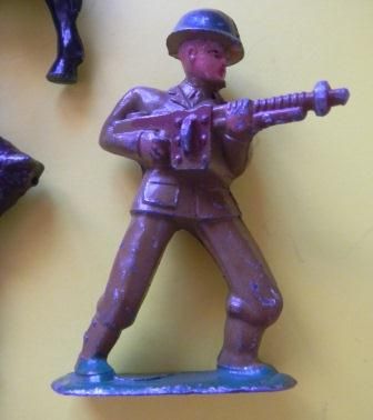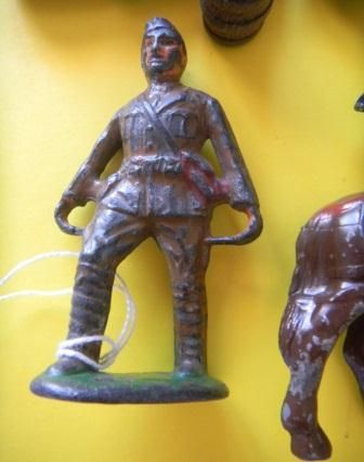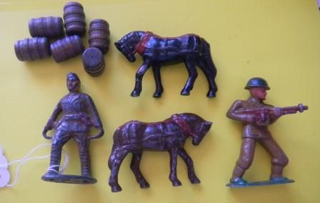 Two toy soldiers and two toy horses and six toy wood barrels. Measurements approximately 2x3 inches. Shipping $15.00 Condition some paint loss
