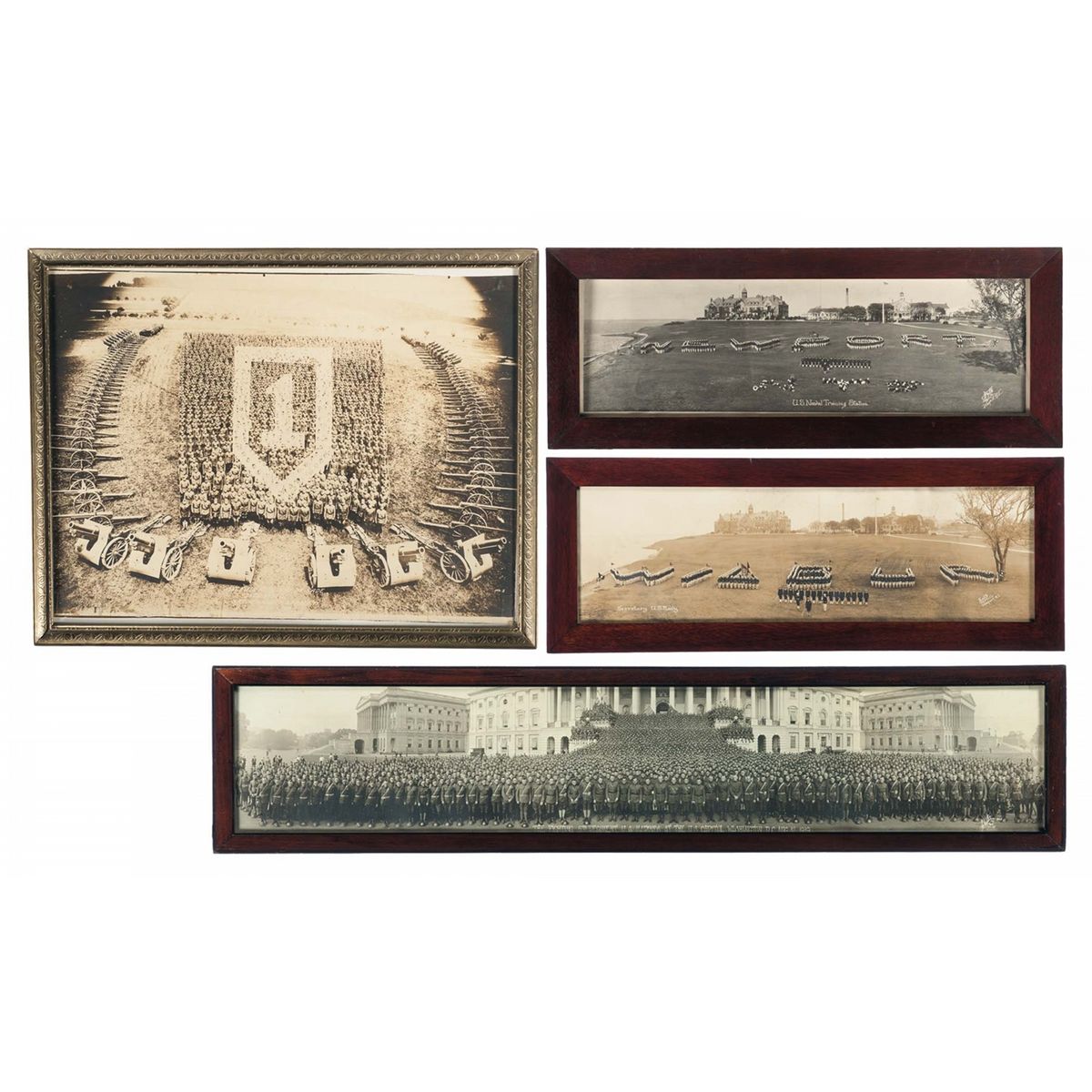 All are framed. 1) Navy serviceman in formation spelling "NEWPORT", U.S. Naval Training Station", frame measures 32 inches x 12 1/2 inches. 2) Navy serviceman in formation spelling "WILBUR", for Curtis Wilbur the U.S. Secretary of Navy from 1924 to 1929, frame measures 35 1/4 inches x 13 1/4 inches. Photograph shows some age wrinkling. 3) The fighting 5th Regiment, U.S. Capital Washington D.C. Aug 12 1919, frame measures 41 inches x 9 inches. 4) 1st Field Artillery Brigade, 1st Division , Grenzhausen, Germany, frame measures 14 inches x 11 inches. Photograph shows some tape repairs near the bottom edge.