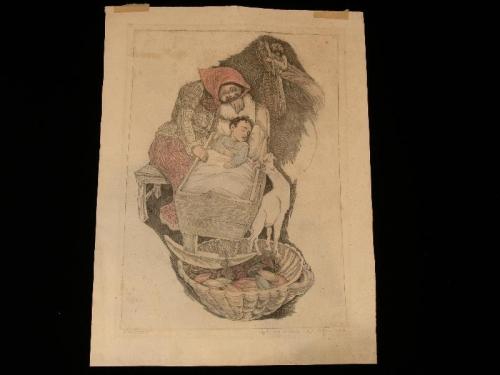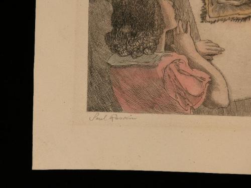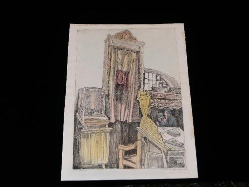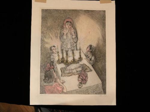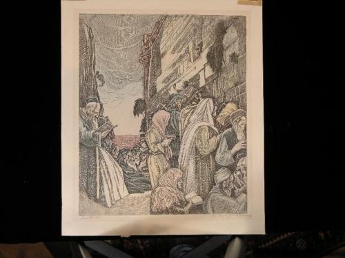 Raskin, Paul. A Small Synagogue in Jerusalem, /s/ l.l. in pencil, color etching, great condition, 12" by 9"; Raskin, Paul. The Wailing Wall, Jerusalem, /s/ l.l. in pencil, color etching, great condition, 11" by 9 1/2"; Raskin, Paul. Mother and Children Blessing Sabbath Candles, /s/ l.r. in pencil, color etching, great condition, 10 3/4" by 8 3/4"; Raskin, Paul. Passover Scene, /s/ l.l. in pencil, color etching, small tear at top middle, 12" by 9"