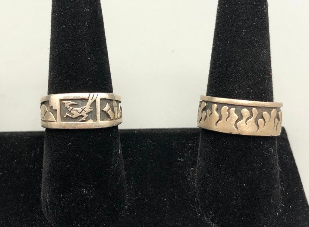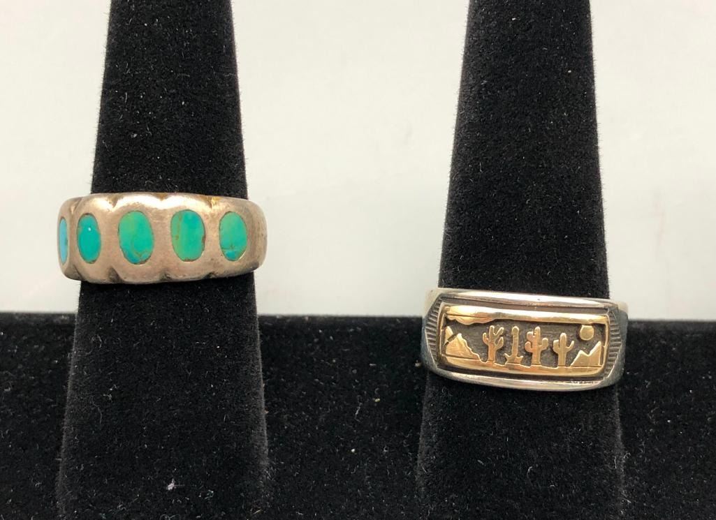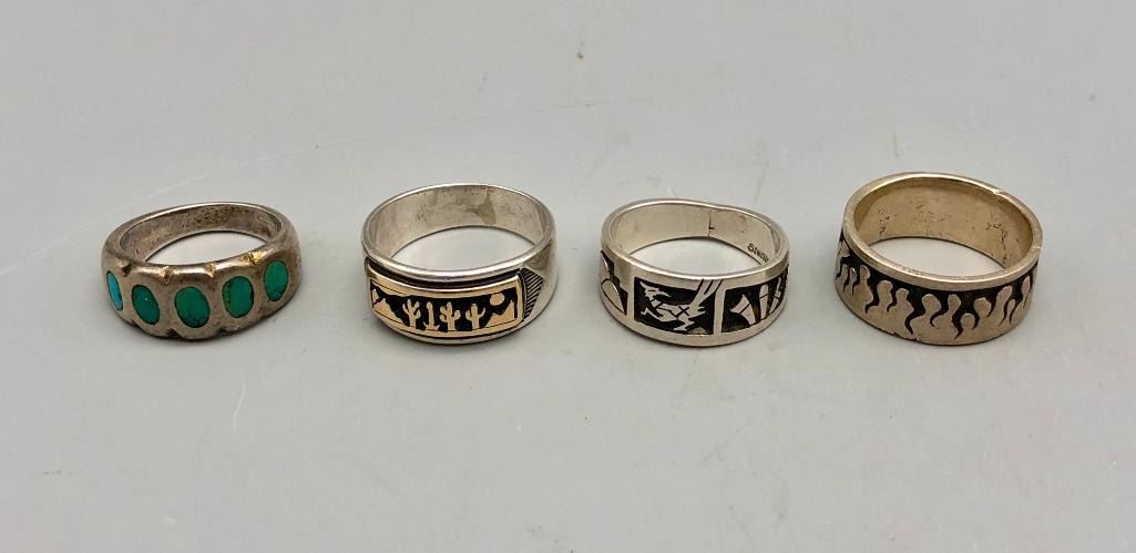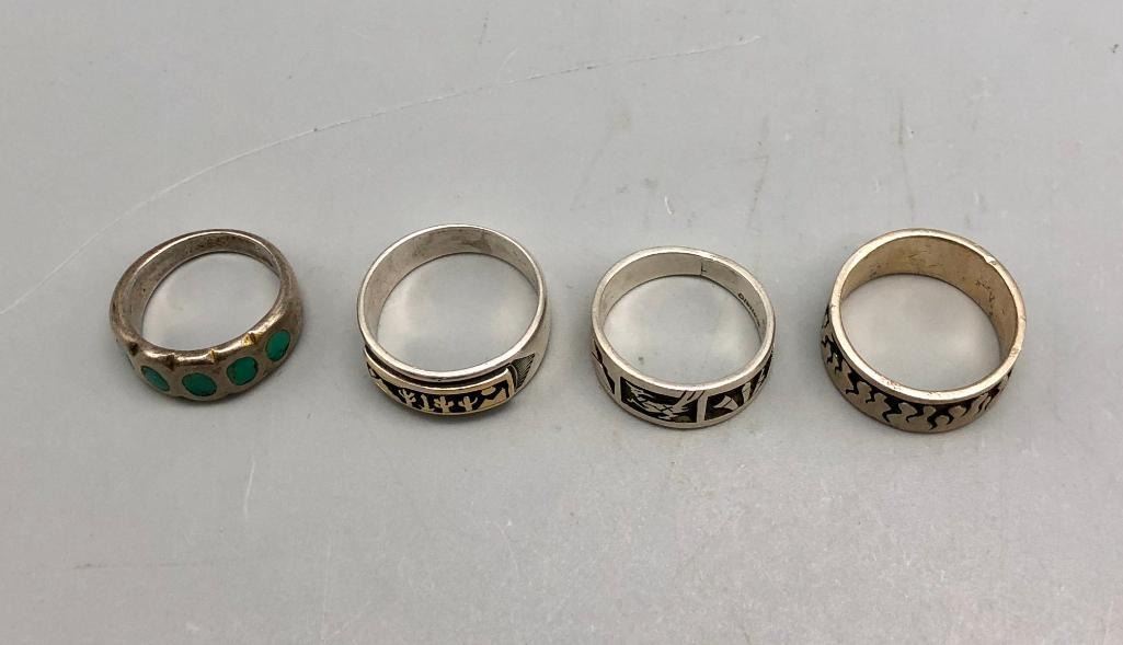 For sale in this lot are four various sterling silver rings. All are larger sized rings with various looks and styles. Some have turquoise, overlay or inlay designs. All are made from sterling silver. MAKER: Various. APPROX AGE: Vintage-Modern. SIZE: Sizes from 8-11. Weighs 29.4 grams. CONDITION: Good for their age, normal wear expected. Please look closely at the pictures as they are an important part of our description and are hereby incorporated into the description, specifically with regards to condition. SHIPPING: There will be a $5 handling / packaging fee for shipping this lot. The actual cost of postage will be added on top of that. BUY IT NOW: If you would like to buy this item now, without waiting for the auction day to bid on it, we do offer this option (which is available up to 48 hours before the actual auction starts). The “Buy it Now†price is the high estimate of this lot (plus applicable fees and the Buyer's premium is discounted to 10% when using the Buy it Now option). If you would like to exercise this option, you must contact us by email (or phone as long as you talk to someone live). Reference this lot number and your intention to "Buy it Now."
