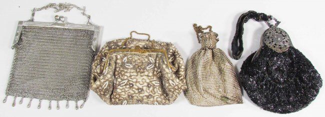 Four Victorian Handbags beaded and metal mesh various sizes and conditions.