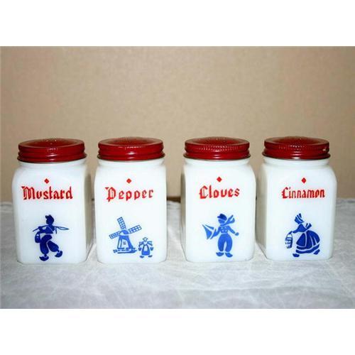 Wonderful Set of four Milk Glass Shakers for your Mustard, Cloves,Cinnamon and Pepper. Standing 3 1/4 inches tall, each enameled with red lettering and depicting blue Dutch scenes. Weighty and well made, they are 1 7/8 inches square with Red enameled tin shaker lids. They each have their original label on the back packed by The Frank Tea & Spice Company Cincinnati Ohio. All four Spice Shakers are in mint condition. What a perfect addition for any Vintage kitchen.