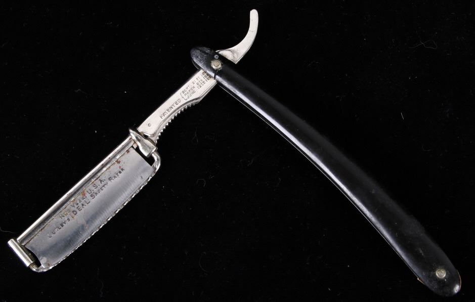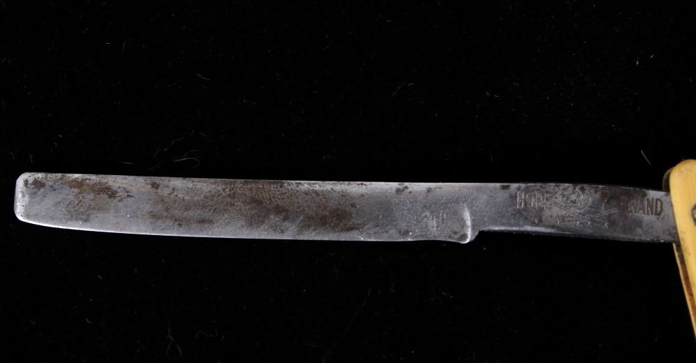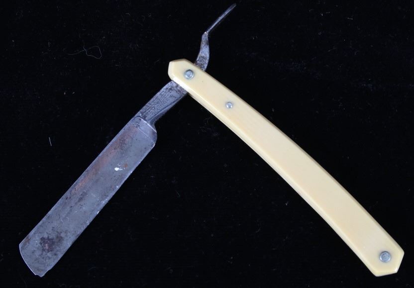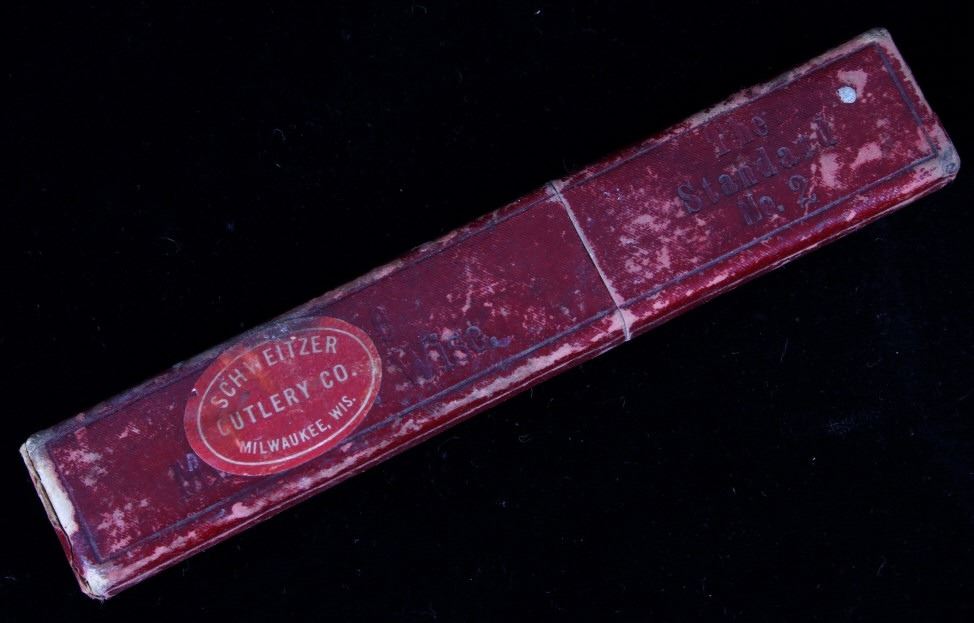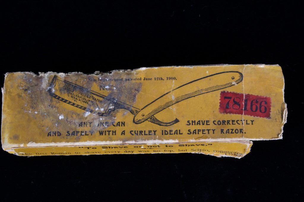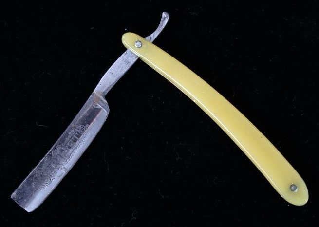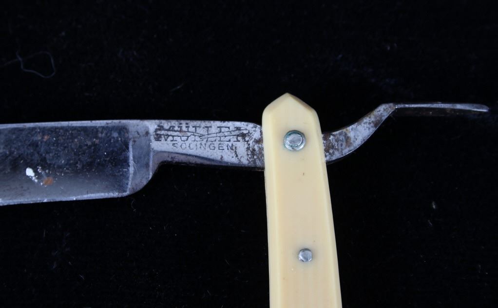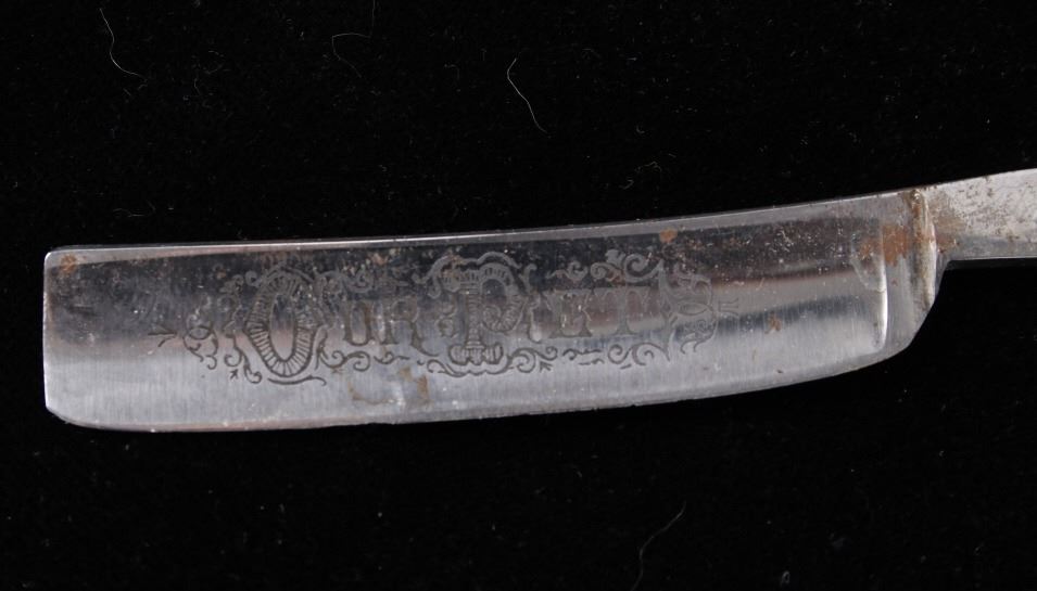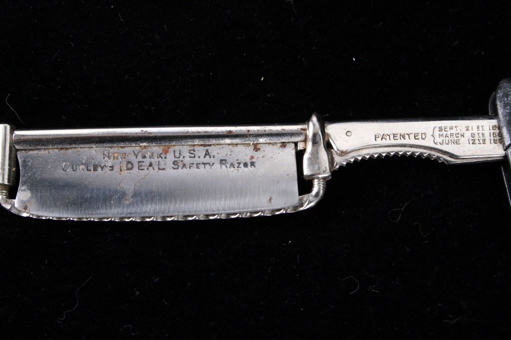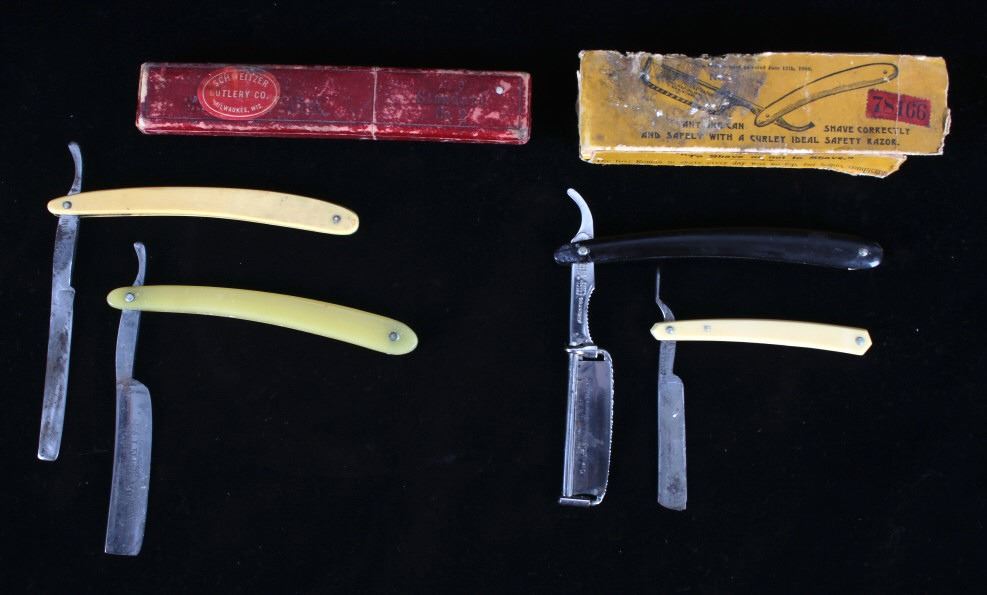 Featured in this lot is this four vintage straight razor collection. each razor features unique celluloid handle and marked blades. The first is marked New York, U.S.A Curley's Ideal Safety Razor Patented Sept 21, 1807, March 5th 1888, June 12, 1907. The second shows an etched blade that reads "OUR PET" with vines etched around it. The third is an Hope Brand straight razor and reads as follows Rashid Bohake 408 So. Clark Chicago, Ill. The last straight razor is the smallest and reads as follows: Muller Solingen. This collection comes complete with two vintage straight razor one from Schweitzer Cutlery Co. out of Milwaukee, Wis. and is called The Standard No. 2. The second vintage box is a Curley Patent Razor with the number faded from sight and a serial number of 78166. The condition of this collection is good with varying sharpness to the blades but otherwise in good overall condition. The measurements of these straight razors range from 4 1/2" x 5/8" x 1/4" to 6 1/4" x 1 1/8" x 1/2".