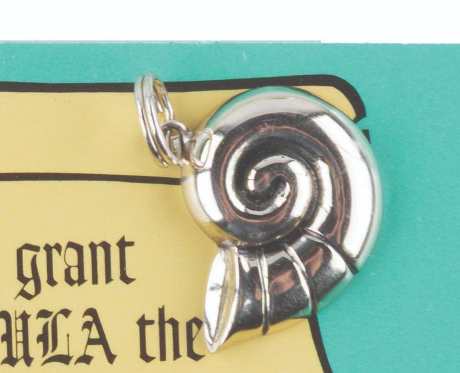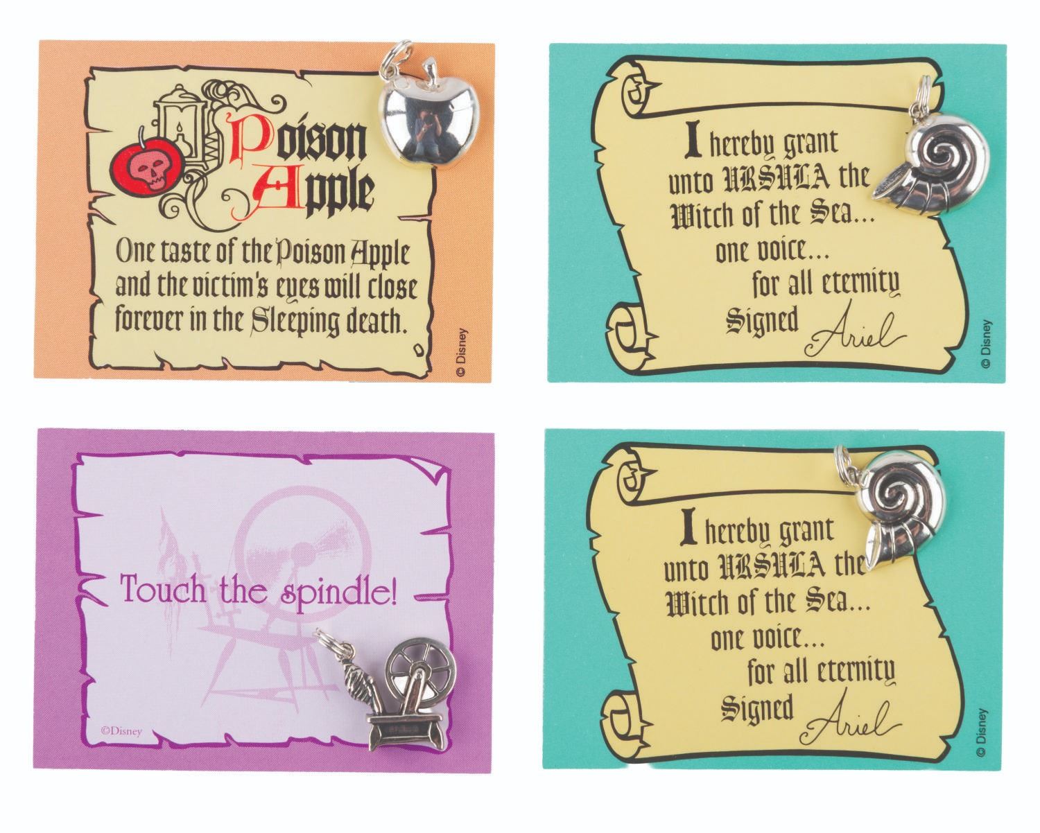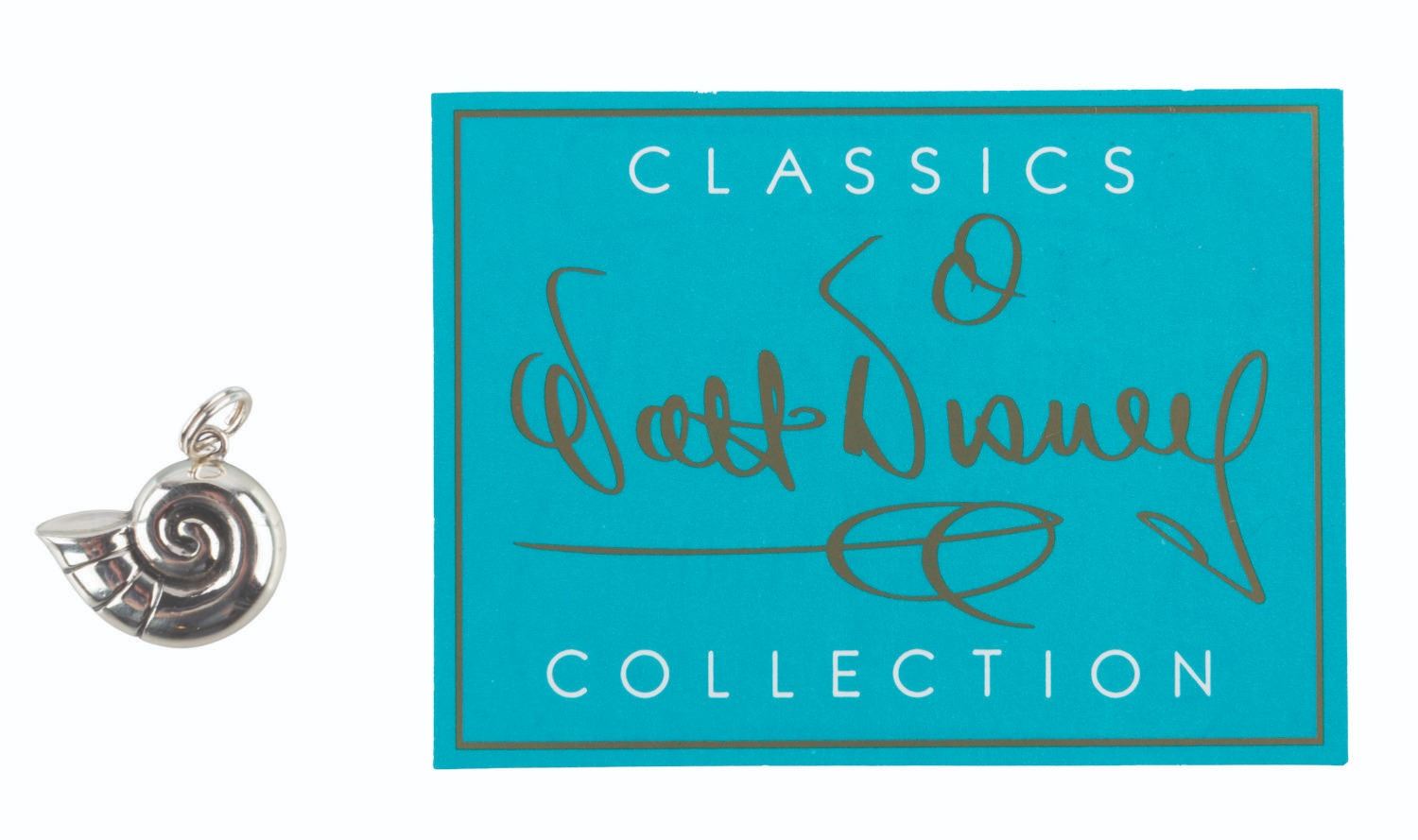 (Disney, 1990s) A set of sterling silver charms based on the Walt Disney Classic Collections annual marks. Included are Snow White’s apple, Briar Rose’s spinning wheel, and two of Ariel's shell. The charms are in fine condition.