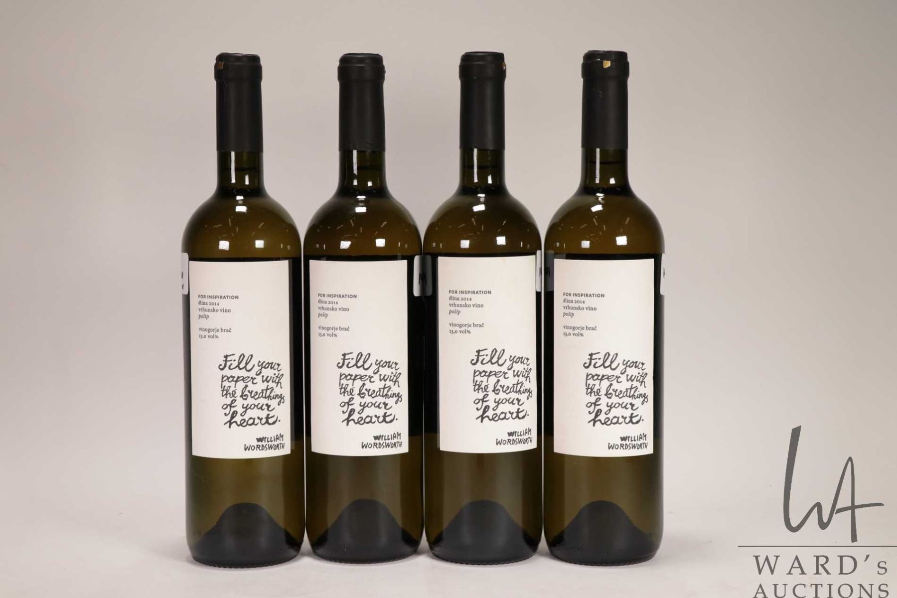 Four bottles of For Inspiration/ 2014/ Stina Posip 750ml/ 13.% ABV Note: Alcohol cannot be insured by any courier in Canada. Local pick up is recommended. Canadian bidders only