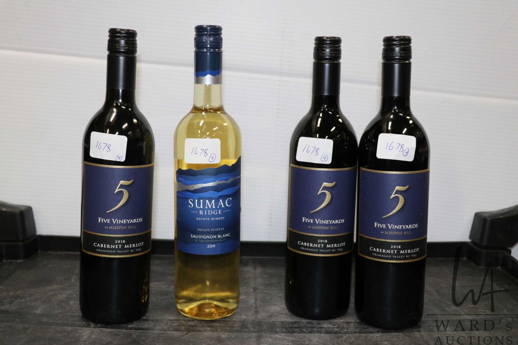 Four bottles of wine including one Sumac Ridge Estate Winery Private Reserve Sauvignon Blanc / 2019 / 750ml / 13.0% ABV and three Five Vineyards by Mission Hill Cabernet Merlot / 2018 / 750ml / 13.0% ABV Note: Alcohol cannot be insured by any courier in Canada. Local pick up is recommended. Canadian bidders only