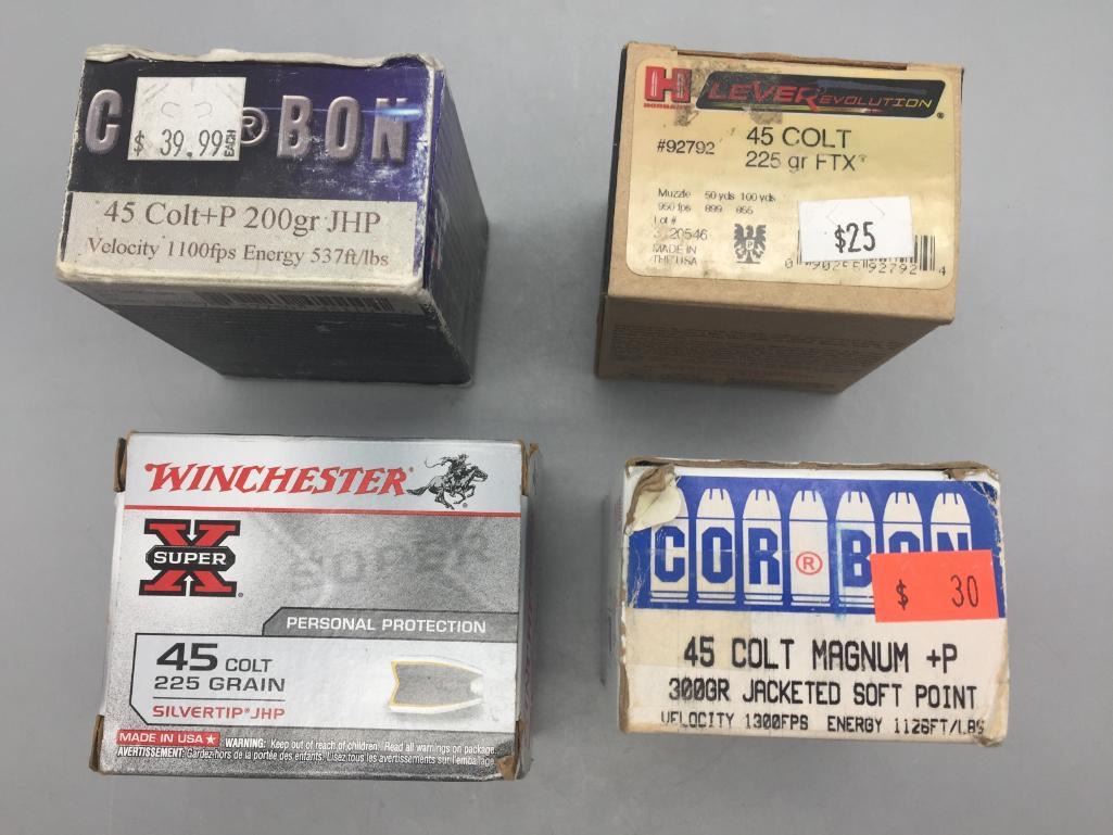 Before you bug out, you will need to stock up on ammo! Here we offer four boxes of .45 colt ammo in their original boxes. Two boxes are from Corbon, one from Hornady, and the other is Winchester. Each box contains 20 cartridges. Maker: Corbon, Hornady and Winchester. Boxes measure approx. 3-1/4" x 2-5/8" x 2". Please look closely at the pictures - they are an important part of our description. Shipping: There will be a $10 handling / packaging fee for shipping this lot. The actual cost of postage will be added on top of that.