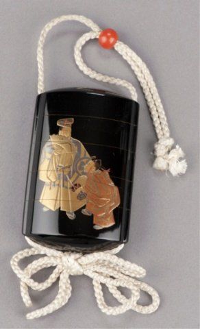 A four-case lacquer inro by Jokasai. 18th/19th century. The front with Shinto Dancers, the back with potted Pine and Bamboo plants and a Lobster on cedar branches, the designs in gold, silver, and red takamakie against a roiro ground. Signed Jokasai saku. 3 1/4" x 2". The Helen & Jack Mang Collection S. Kriger, Inc. Washington, DC
