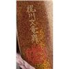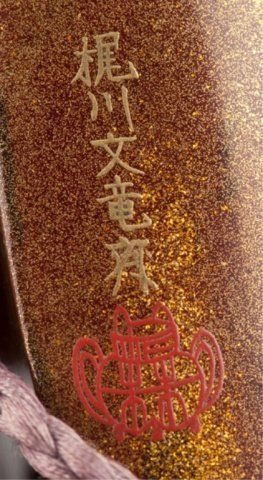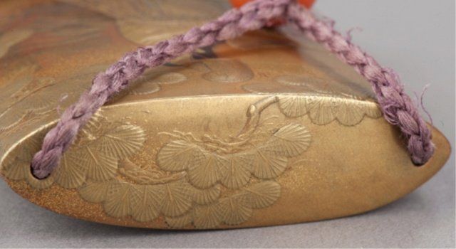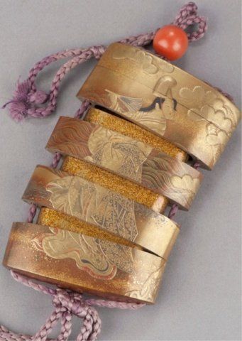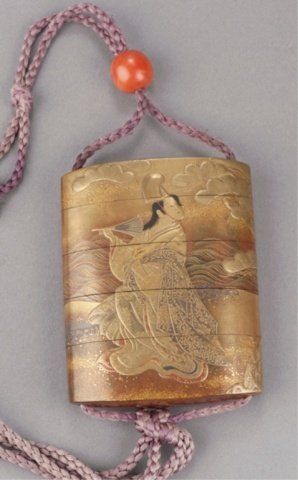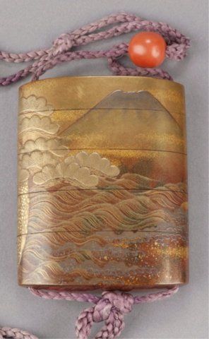 A four-case lacquer inro by Kajikawa. 18th century. Scene of Prince Genji under pine trees in gold, red, black and silver takamakie against a background of togidashi waves and gold hirame and kirikane squares, the reverse with Mount Fuji, nashiji risers, pine trees and waves. Signed Kajikawa Bunryosai with a red pot seal. 3" x 7/8". The Helen & Jack Mang Collection Tendler Estate