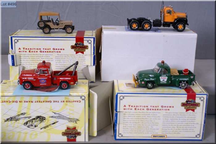 Four collectible boxed Matchbox die-cast cars including two tow trucks, a semi tractor unit and a Jeep