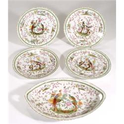 Four continental porcelain plates and a twin handled serving dish, hand coloured and transfer printed with pheasants amongst flowers, marks to base