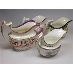 Four early 19th century sauce boats, to include: a Spode style boat printed in black with pattern number 557, a lustre boat, a puce printed boat with mother and child and a blue printed boat overpainted with the floral pattern 359 (W) (4) £120-180