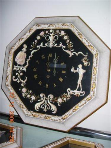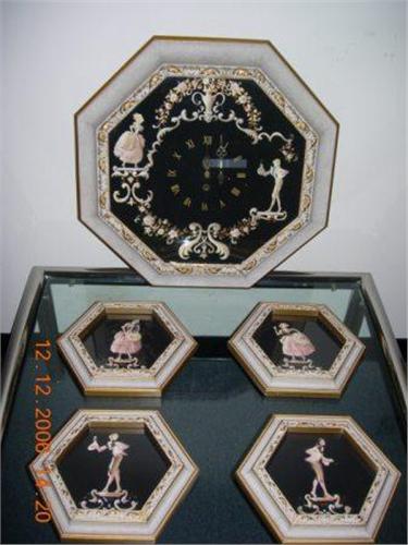 The clock measures approximately 24" tall and 24" wide. The prints measure approximately 11" wide and 11" tall.
