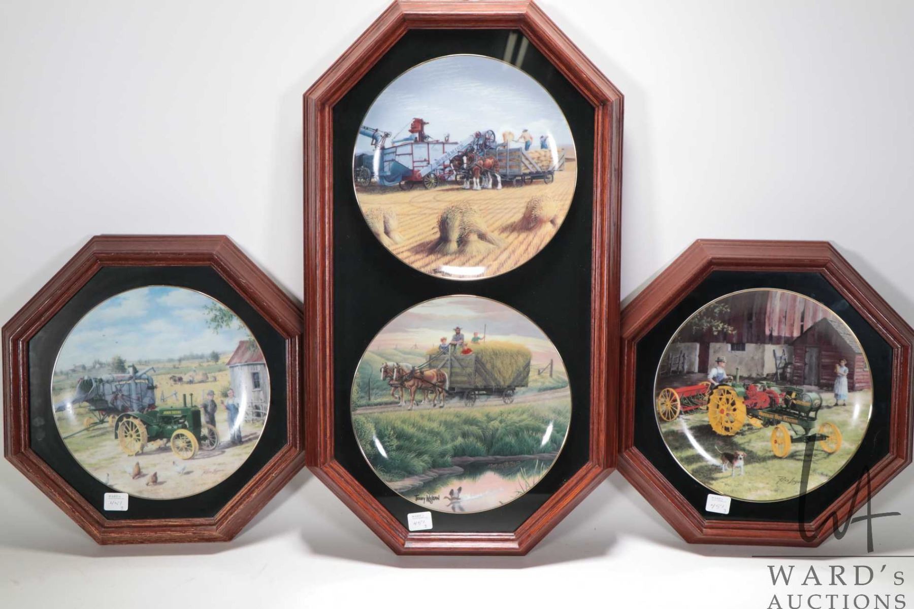 Four framed farm scene motif collector plates including "Waterloo Boy" and "Farmers Pride" by Ross L