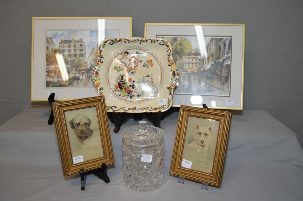 Four framed prints including two street scenes and two dogs plus a collector plate and a crystal biscuit barrel