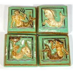 Four green and brown glazed square Studio Pottery tiles moulded with mythical sea creatures and G…