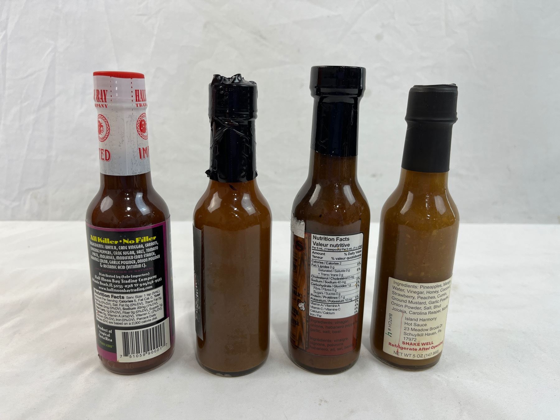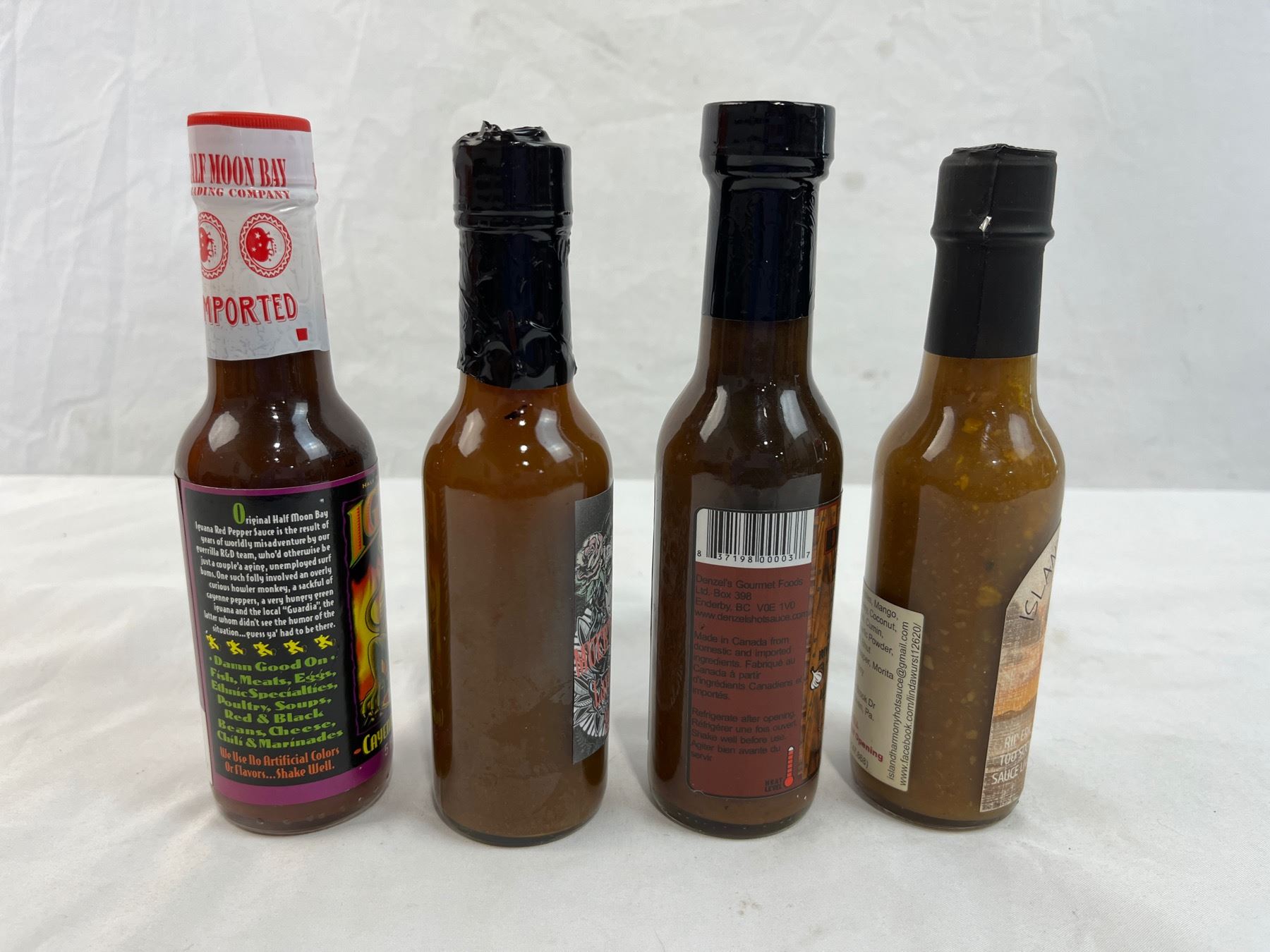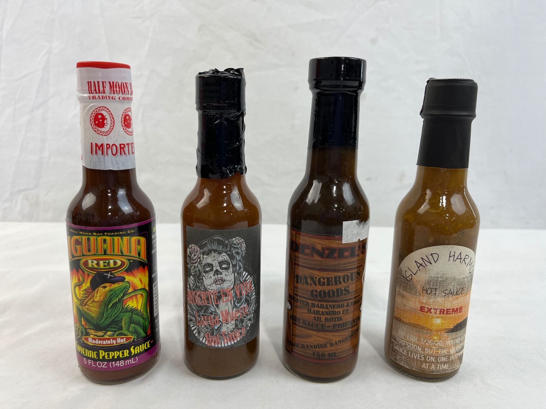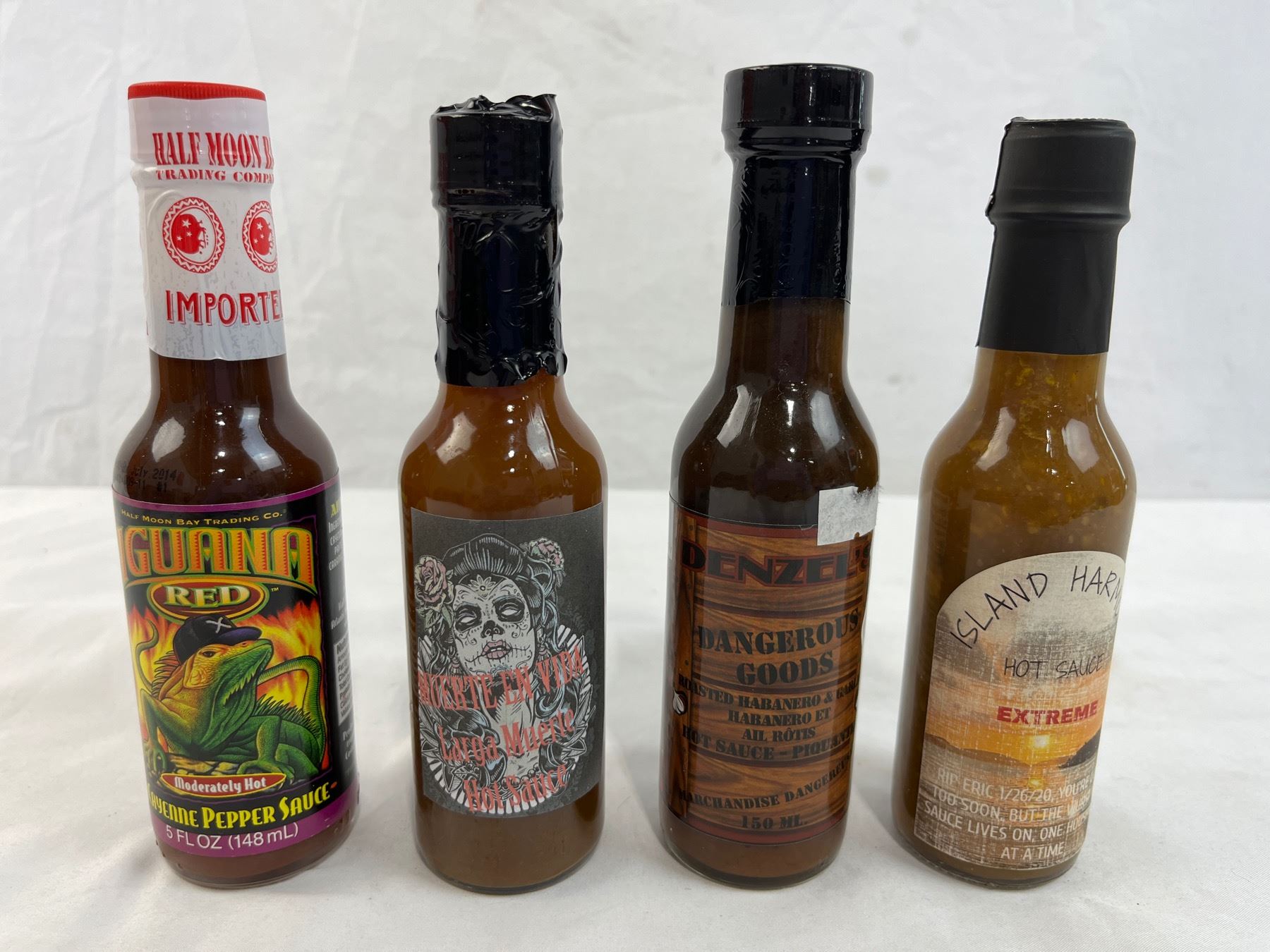 Island harmony extreme, Denzel's Dangerous goods, Iguana Red, and muerte en vida 5oz bottles
