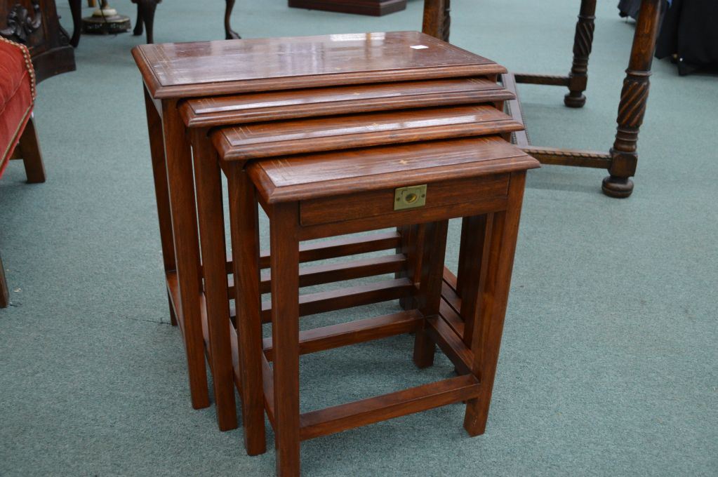 Four piece stacking nesting table each with metal inlaid tops and smallest one has a small drawer