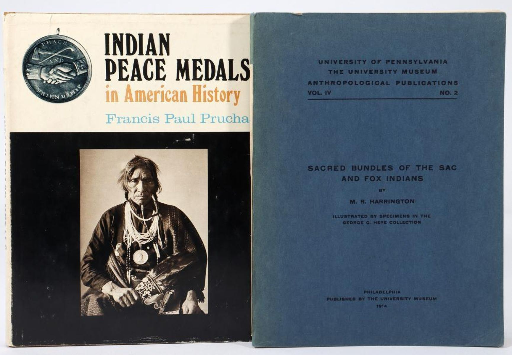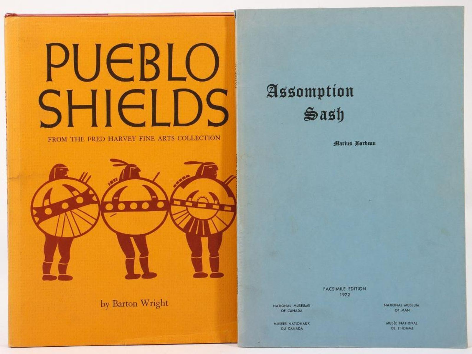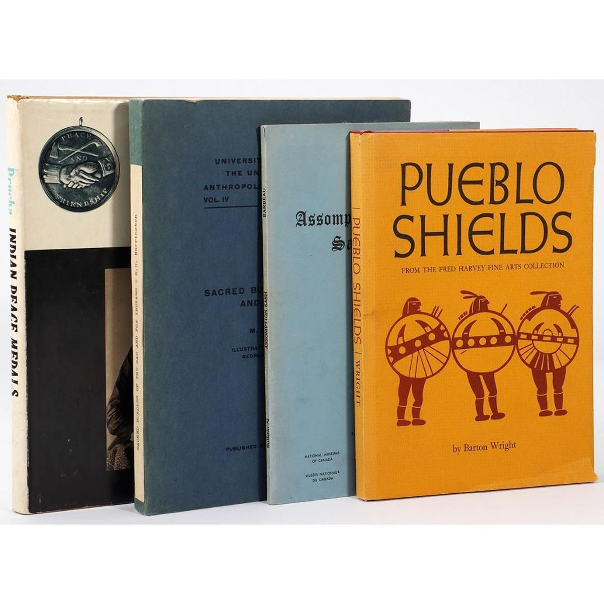 Four references on Native American material culture. 1.) BARBEAU, MARIUS. Assomption Sash. Bulletin 93, Anthropological Series No. 24; Facsimile Edition. National Museum of Canada, 1972. 2.) HARRINGTON, M. R. Sacred Bundles of the Sac and Fox Indians. Illustrated by Specimens in the George G. Heye Collection. University of Pennsylvania, the University Museum Anthropological Publications, Vol. IV, No. 2. Philadelphia: University Museum, 1914. 3.) PRUCHA, FRANCIS PAUL. Indian Peace Medals in American History. Madison: The State Historical Society of Wisconsin, 1971. 4.) WRIGHT, BARTON. Pueblo Shields From the Fred Harvey Fine Arts Collection. Northland Press, 1976. Stated first edition. Condition: Fair-Very Good; the volumes are from a well-used research library; tears to dust jackets; some light toning; some with owners' signatures.