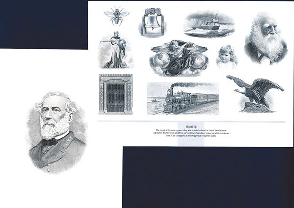 Borders & Ornaments, and Vignettes from United States Banknote Corp. Six images on one sheet from ABNC, and a BEP Robert E. Lee. Nice group of the art form. 4 pages.