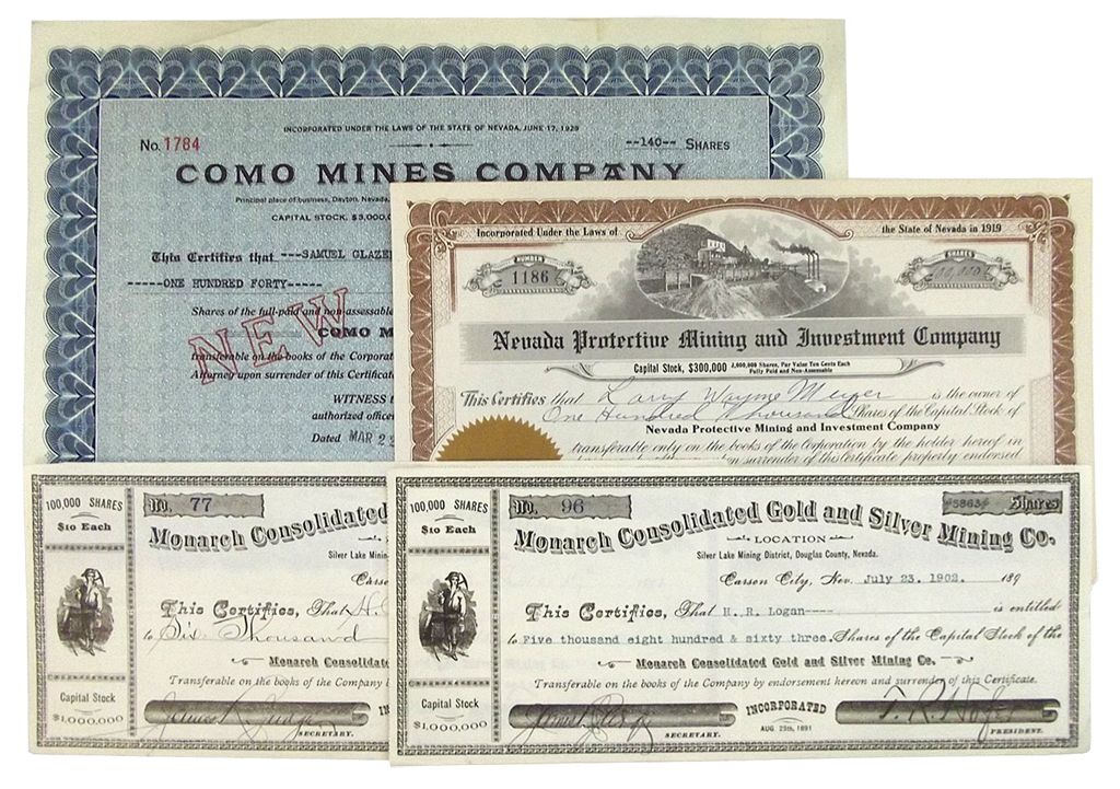 2 Monarch Consolidated Gold stocks. The first was issued to H. R. Logan on December 17, 1891 for 6000 shares. Logan must have believed in the company because the second is issued to him in 1902 for 5863 shares. There were only 18 other stock certificates sold in the 11 years between his purchases. I guess other investors didn't have his faith. Both are signed by president TR Hofer and secretary James Judge. 1 Nevada Protective Mining stock, 1919. 1 Como Mine Company stock 1938City: County: State: NV