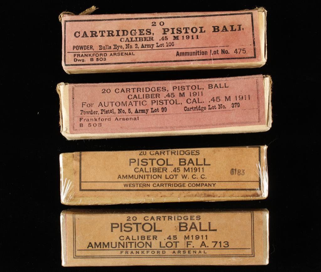 Four unopened boxes of U.S. Military .45 caliber cartridges including two Frankford Arsenal 20-round boxes with red label, a Western Cartridge Co. box of 20 pistol ball cartridges with tan label and a Frankford Arsenal box of 20 pistol ball cartridges, also with tan label. Condition: All four of these boxes are in overall very good to fine condition. EST.: $100-$300