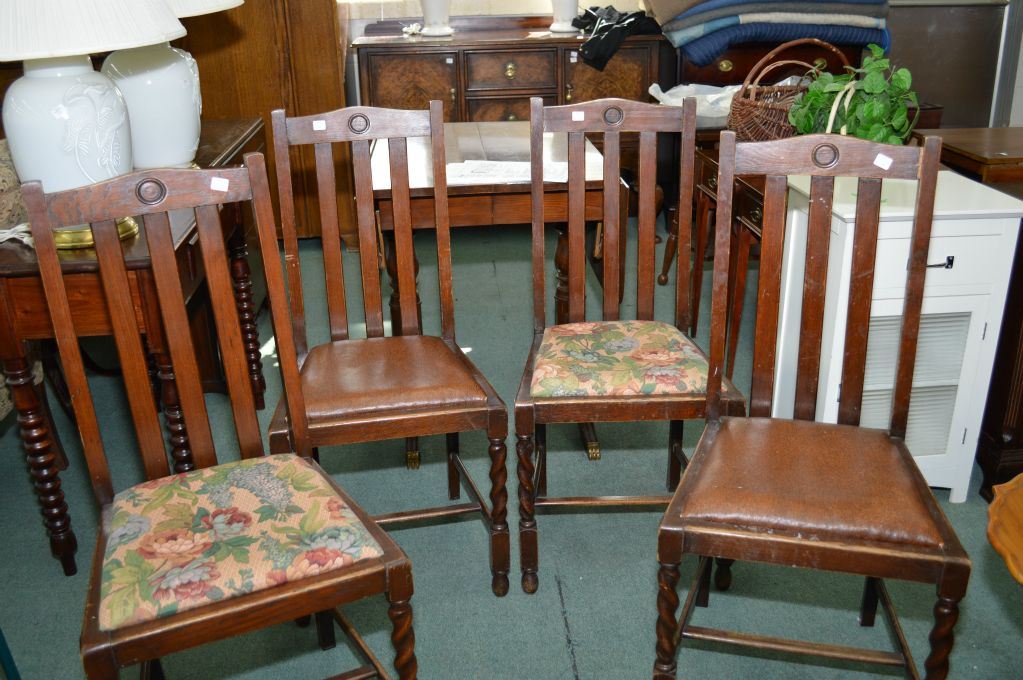 Four upholstered slat back dining chairs, two with leather and two the floral fabric