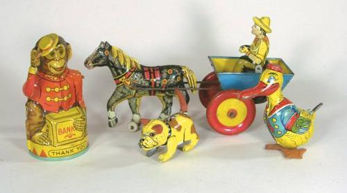Four various tin toys including wind-up duck, wind-up dog, Monkey bank and horse/wagon. Fair to Good Cond.