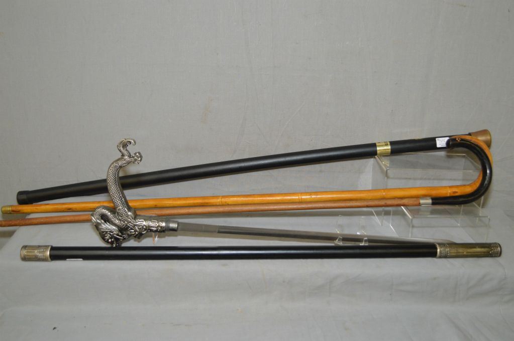 Four walking canes including dragon motif sword cane, a booze cane and two curved canes including one with ebonized handle