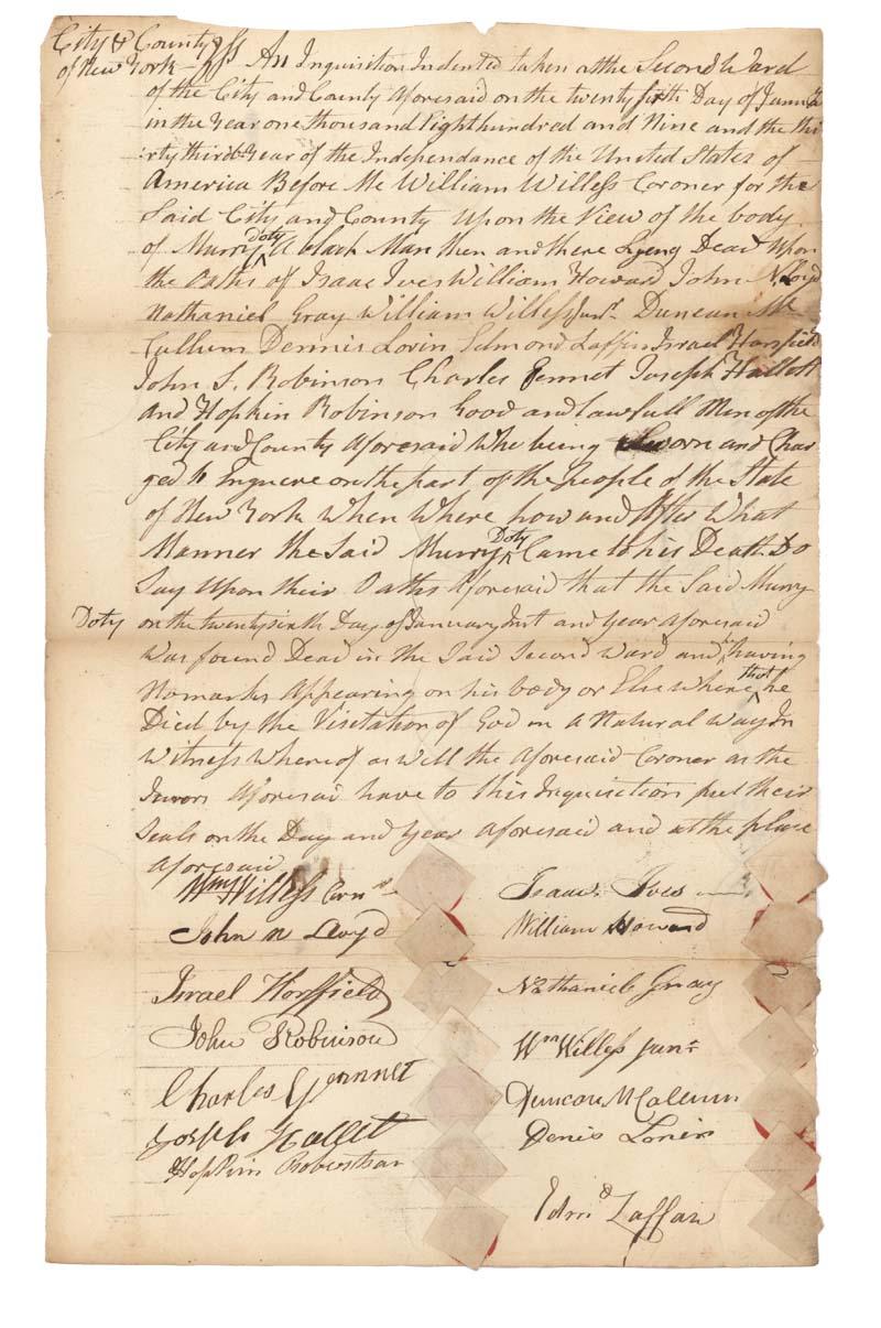 “ … William Willess Coroner for the Said City and County Upon the View of the body of Murry Doty a black man then and there lying dead … Upon the oaths of … Good and lawfull men of the city … being sworn and charged to enquire on the part of the people of the state of New York when where how and after what manner the said Murry Doty came to his death Do say upon their oaths Aforesaid that the said Murry Doty on the twenty sixth day of January … was found dead in the said second ward and he having no marks appearing on his body or elsewhere that he died by the visitation of God in a natural way … ” The Fourteen witnesses have signed and affixed their seal to the bottom of document in two rows of seven. Some toning and numerous blind-embossed seals, some of which have cut document at points.