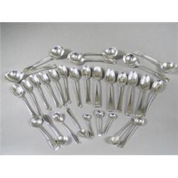 Fourteen silver teaspoons, nine assorted mustard spoons and a set of six silver soup soons, vario...