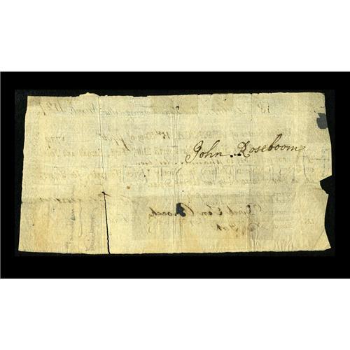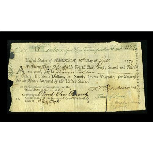 <B>Fourth Bill of Sight $18 Sep. 15, 1779 For Interest Due on Money Borrowed by the United States.</B></I> This was signed by F(rancis) Hopkinson a signer of the Declaration of Independence. This fact is pencilled on the face. There are also splits, ink erosion, tears and repairs noticed. <B>Good.</B></I>