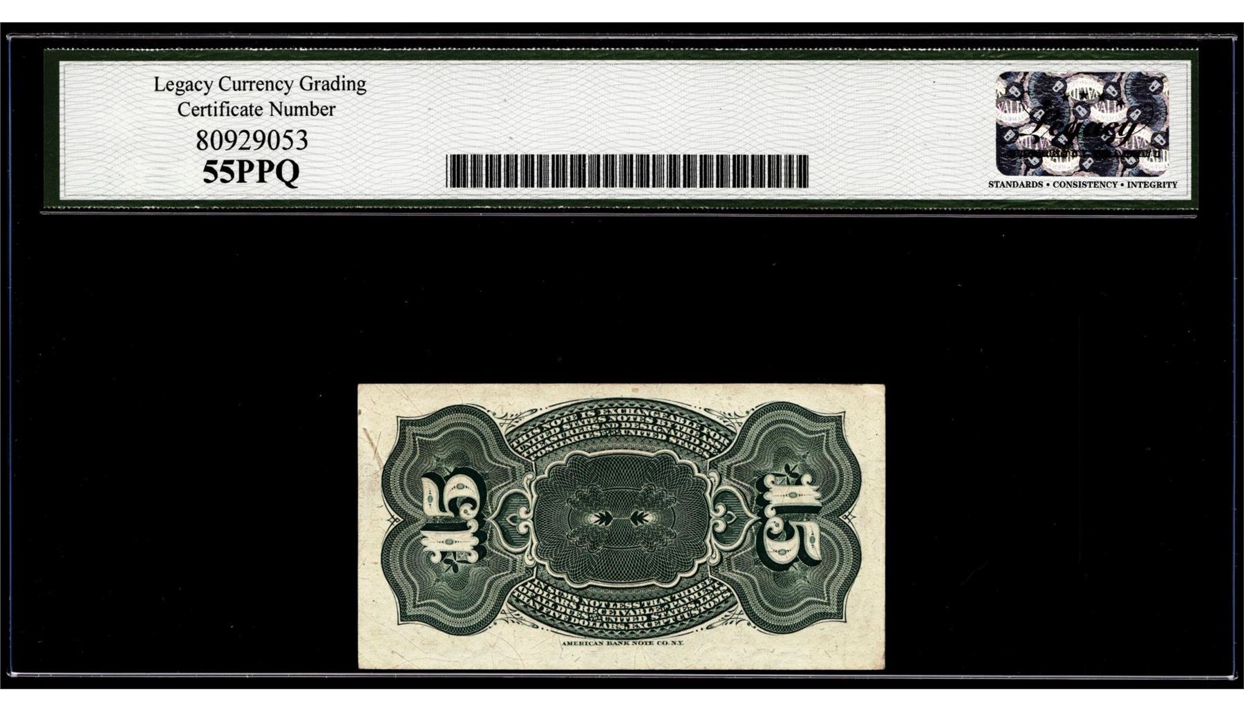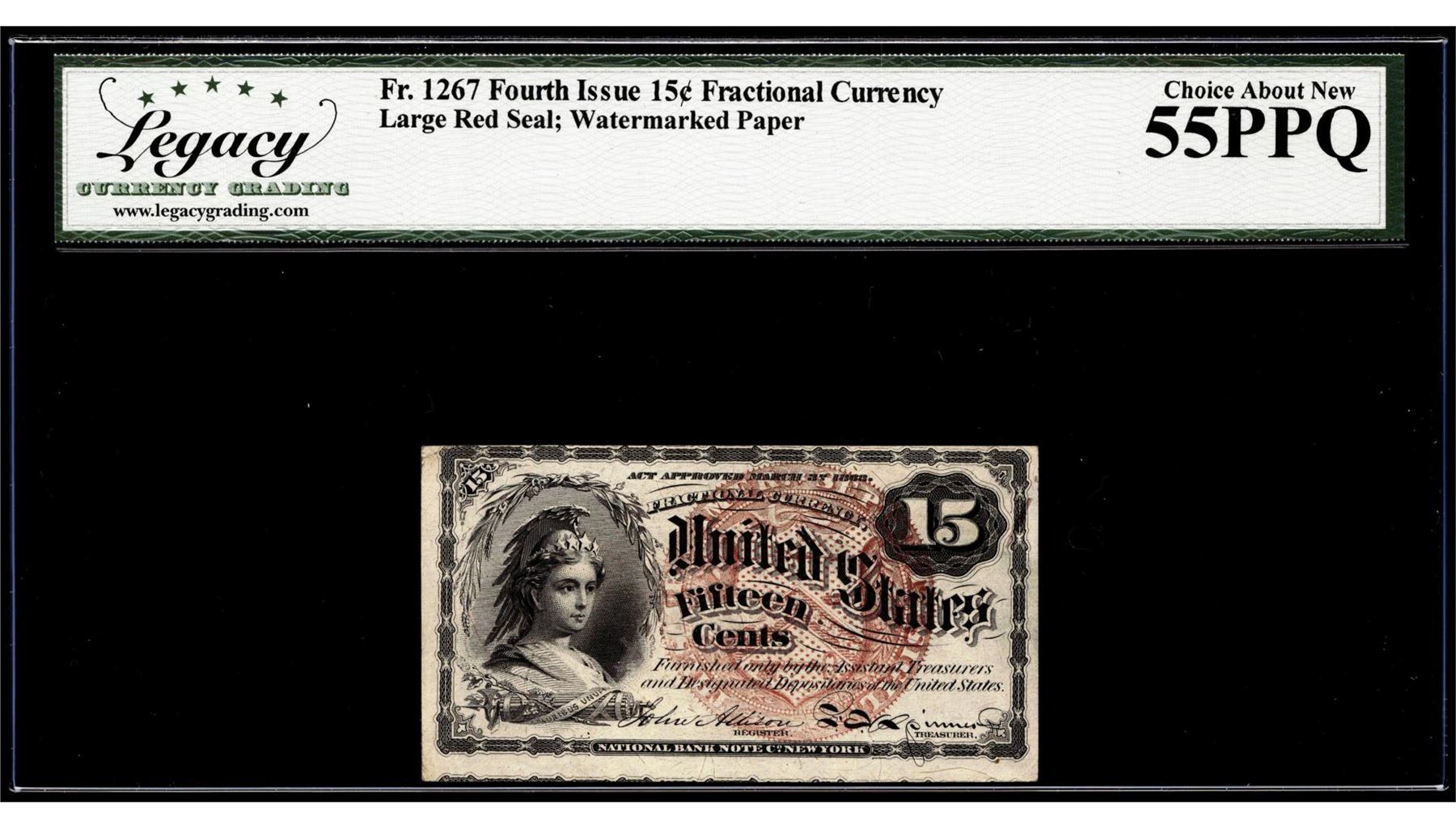 One Fourth Issue 15 Cents Fractional Currency Note Fr.1267 Legacy Choice About New 55PPQ. Legacy Graded.