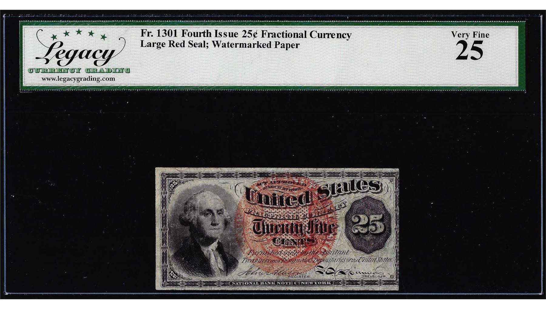 One Fourth Issue 25 Cents Fractional Currency Note Fr.1302 Legacy Very Fine 25. Legacy Graded.