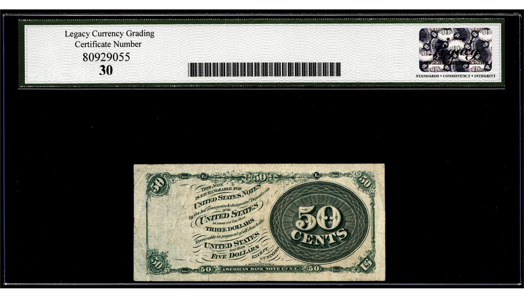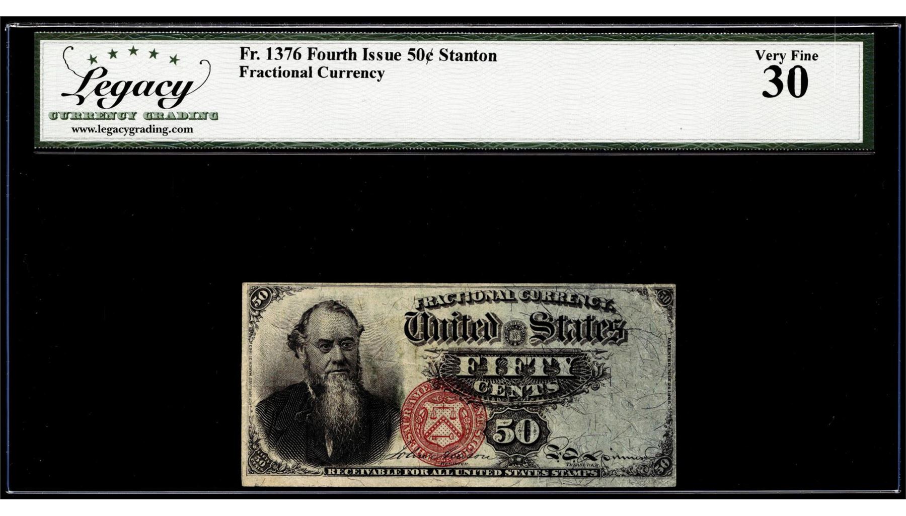 One Fourth Issue 50 Cents Stanton Fractional Currency Note Fr.1376 Legacy Very Fine 30. Legacy Graded.
