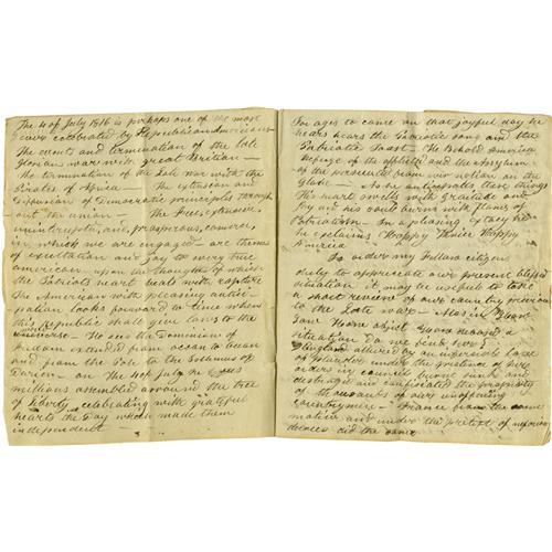 <B>Fourth of July 1816 Oration.</B></I> Manuscript, fifteen pages bound with wire, 6.25" x 7.5", Southampton, July 4, 1816. Notation on verso reads: "<I>4th of July Oration delivered by Wm. Jessup at Southampton in 1816</B></I>". Text for a speech given on Independence Day just about a year following the War of 1812. "<I>...The 4 of July 1816 is perhaps one of the most glorious ever celebrated by Republican Americans -- The events and termination of the late glorious war with Great Britain -- The termination of the late War with the Pirates of Africa -- The extension and Diffusion of Democratic principles through out the union -- The free, extensive, uninterrupted, and, prosperous commerce... are themes of exultation and joy to every true American... The American with pleasing anticipation looks forward to a time when this republic shall give laws to the world...</B></I>" Jessup then proceeds to narrate the atrocities committed by the French and the British before the War of 1812: "<I>... thousands of our seamen were dragged from their homes... dragged from his family and country to fight the battles of a nation which his soul abhors... </B></I>" Jessup also reminds his audience of the blessings of liberty including "<I>...Education, and we must consider the extension of political knowledge as one of our greatest privileges -- A free and unrestricted Press is an invaluable blessing to any people --- to a republic it is indispensable -- this is the Vehicle of Knowledge of our enlightened people without which how soon would they sink into insignificancy --- The first ambitious aspiring Demagogue would bind the iron brand of slavery fast upon their necks... an enlightened people can never be slaves...</B></I>" Much more fine content. Early celebratory orations recalling the Founding Fathers and their contribution to American independence are quite desirable; this is one of the finest we've encountered. <I>From the Henry E. Luhrs Collection.</B></I>