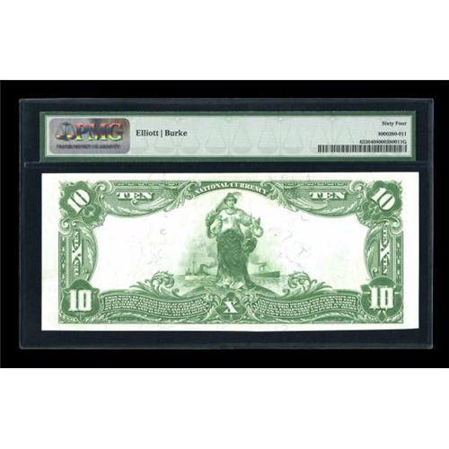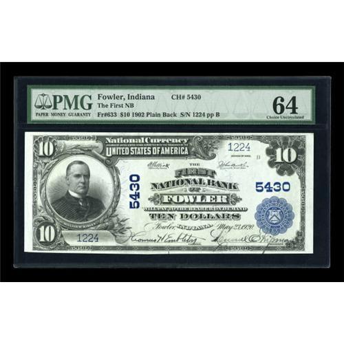 <B>Fowler, IN</B></I> - $10 1902 Plain Back Fr. 633 <B>The First NB</B></I> Ch. # 5430<BR> A bright and attractive example which is one of a short run of uncirculated large notes from this bank. Beautifully pen signed <B>PMG Choice Uncirculated 64</B></I>.<BR><BR><b>Shipping:</b> Coins & Currency (<a target="_blank" href="http://www.heritageauctions.com/common/shipping.php">view shipping information</a>)