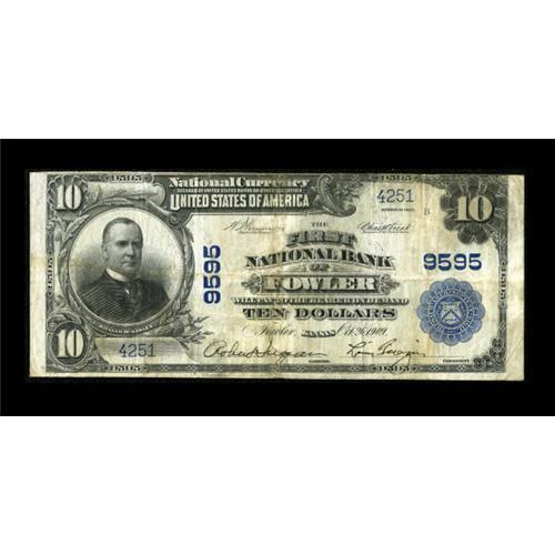 <B>Fowler, KS</B></I> - $10 1902 Plain Back Fr. 626 <B>The First NB</B></I> Ch. # 9595<BR> A scarce note from Meade County in southwest Kansas. Pen signed <B>Fine-Very Fine.</B></I><BR><I>From The J.S. Weber Collection.</B></I><BR><BR><b>Shipping:</b> Coins & Currency (<a target="_blank" href="http://www.heritageauctions.com/common/shipping.php">view shipping information</a>)