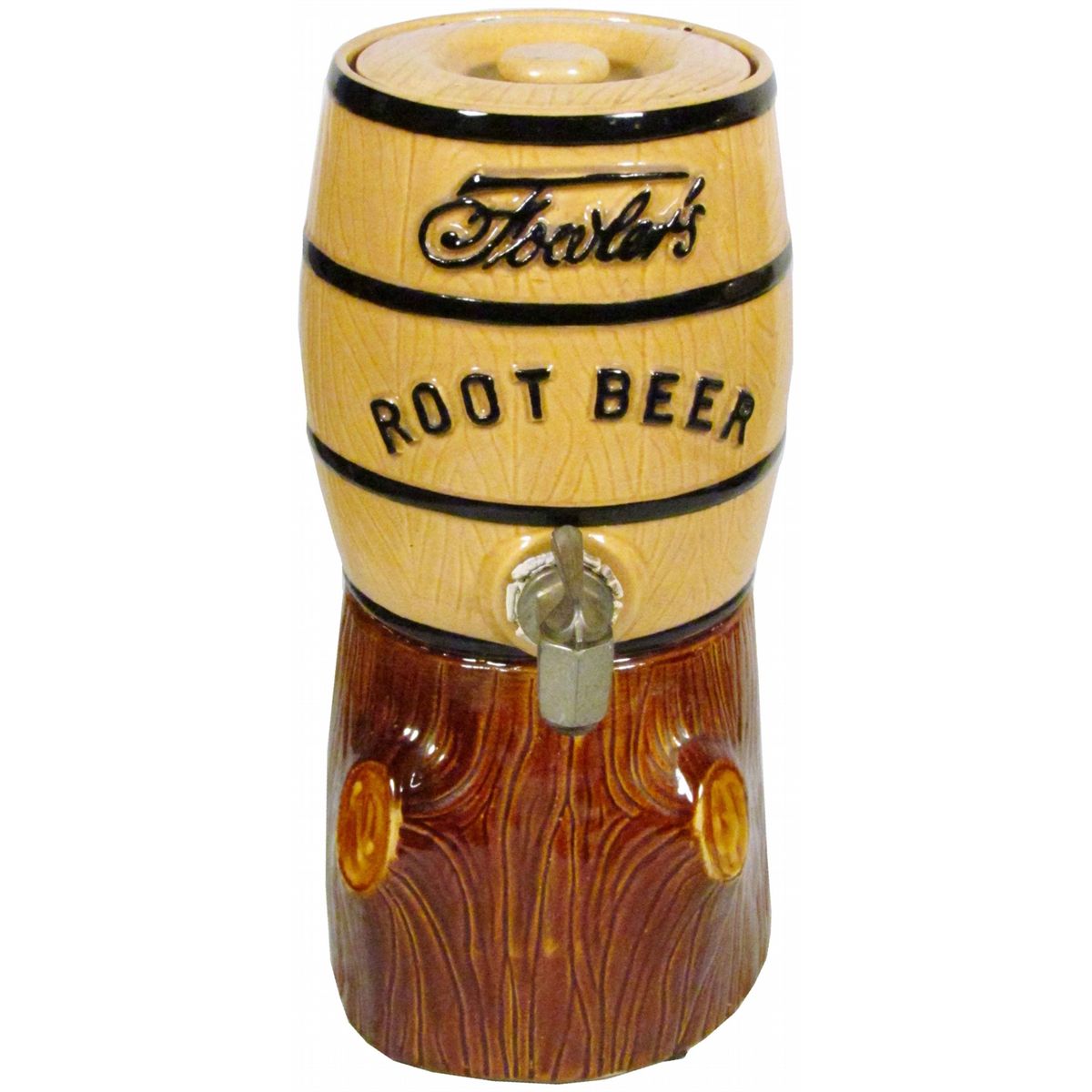 Fowler's Root Beer Syrup Dispenser. Bradley & Hayes Mfg. Tiny chip on inside lid and crack on lid. 12 3/4 inches tall.