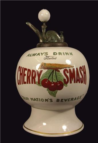 Fowlers Cherry Smash Syrup Dispenser, period style pump. Some restoration to lettering, no chips or cracks. 16 inches tall.