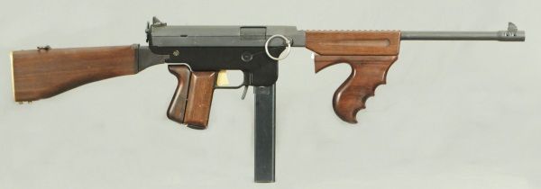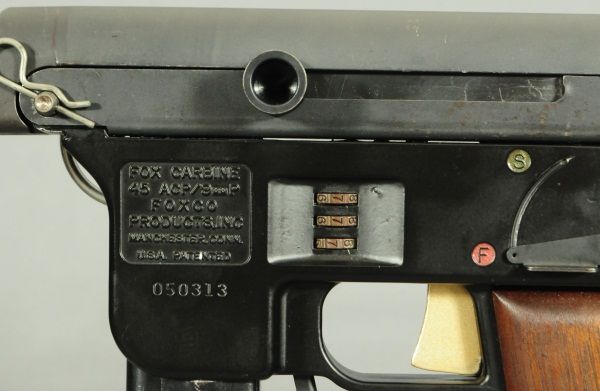 Fox Carbine .45 Semi Auto. Fox Carbine .45 ACP/9mmP Foxco Productions, Inc Manchester, Conn. Has combination lock mechanism on side of receiver in order to fire weapon. Ser# 050313.