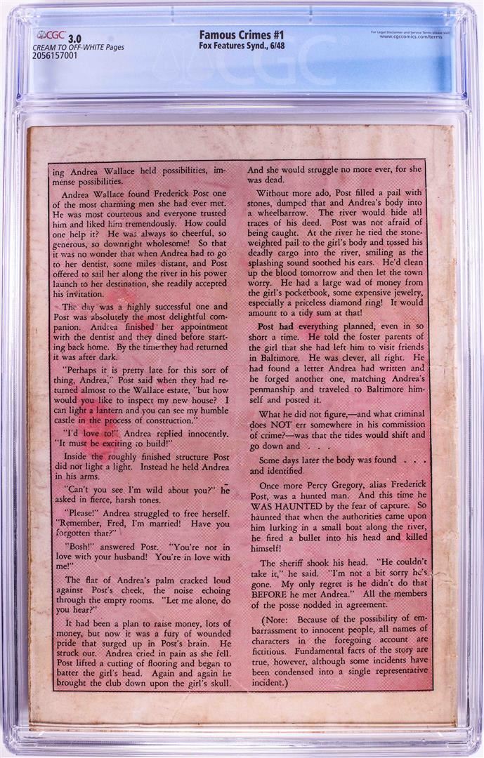 One Fox Features Syndication Famous Crimes #1 Comic Book 6/48 CGC 3.0. CGC Graded.